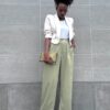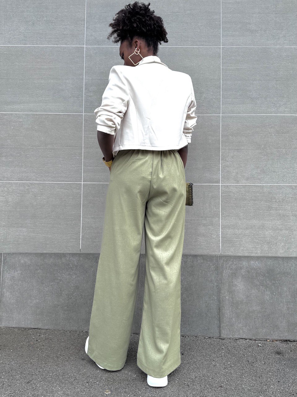 Pantalone a palazzo elasticizzato con taschine laterali a tinta unita.