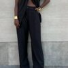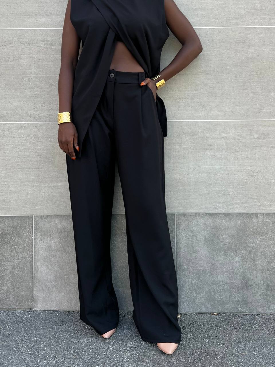 Pantalone a vita alta a palazzo con dettaglio di bottone e zip a tinta unita. Elasticizzato.
