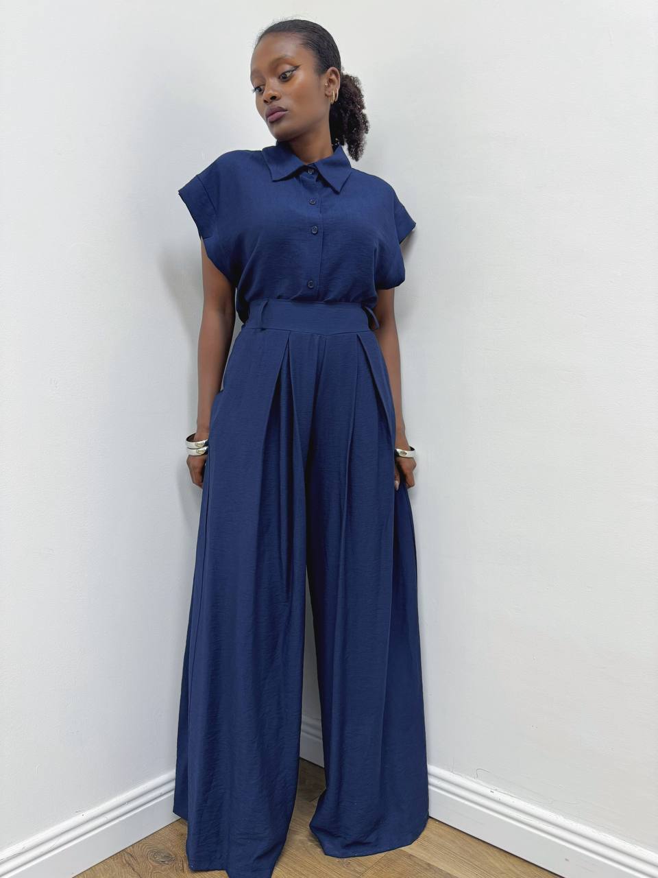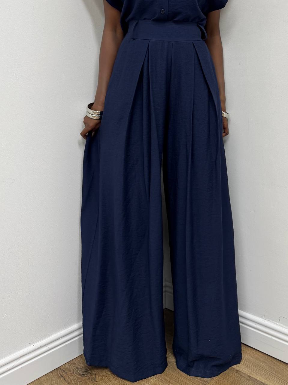 Pantalone elasticizzato sul punto vita a tinta unita con taschine laterali. Dettaglio di pince. Dotato di passanti per cintura.