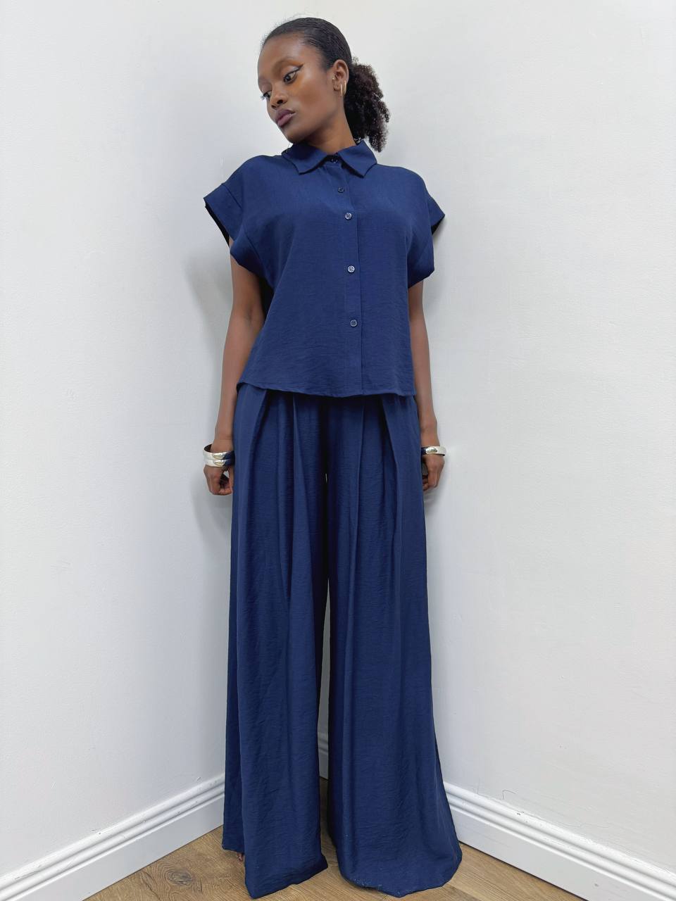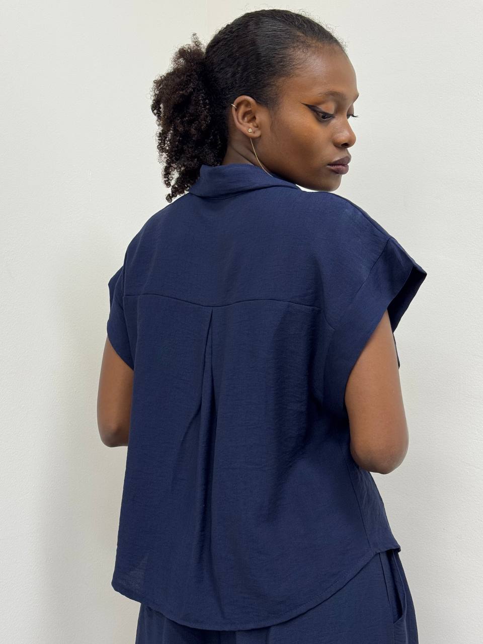 Camicia a manica corta con dettaglio di bottoni di chiusura tono su tono su tutta la lunghezza.