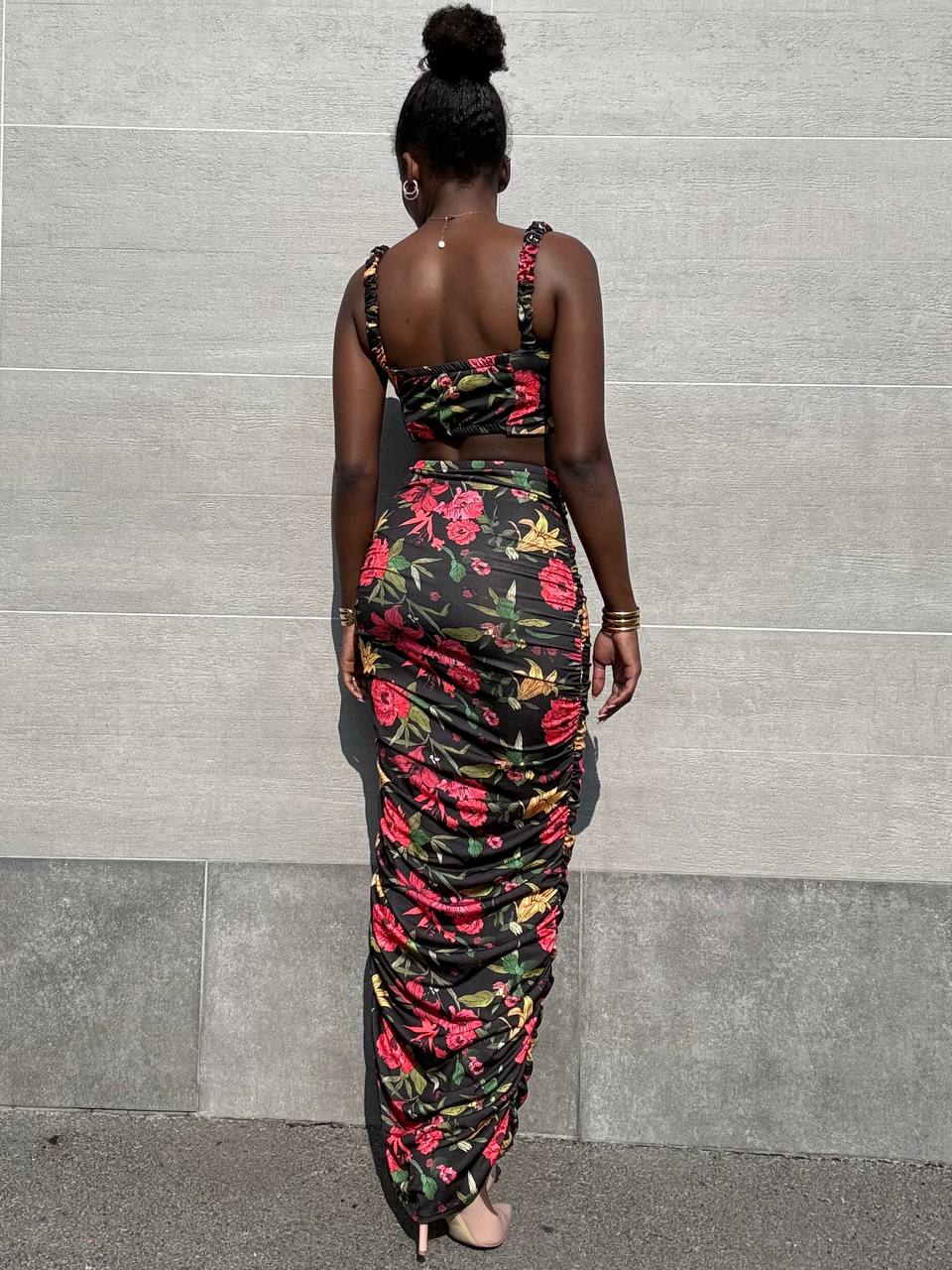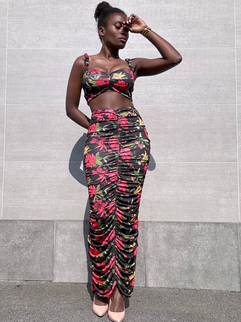 Gonna elasticizzata completamente drappeggiata con stampa fiorata su tutta la lunghezza.