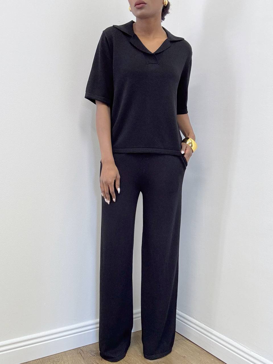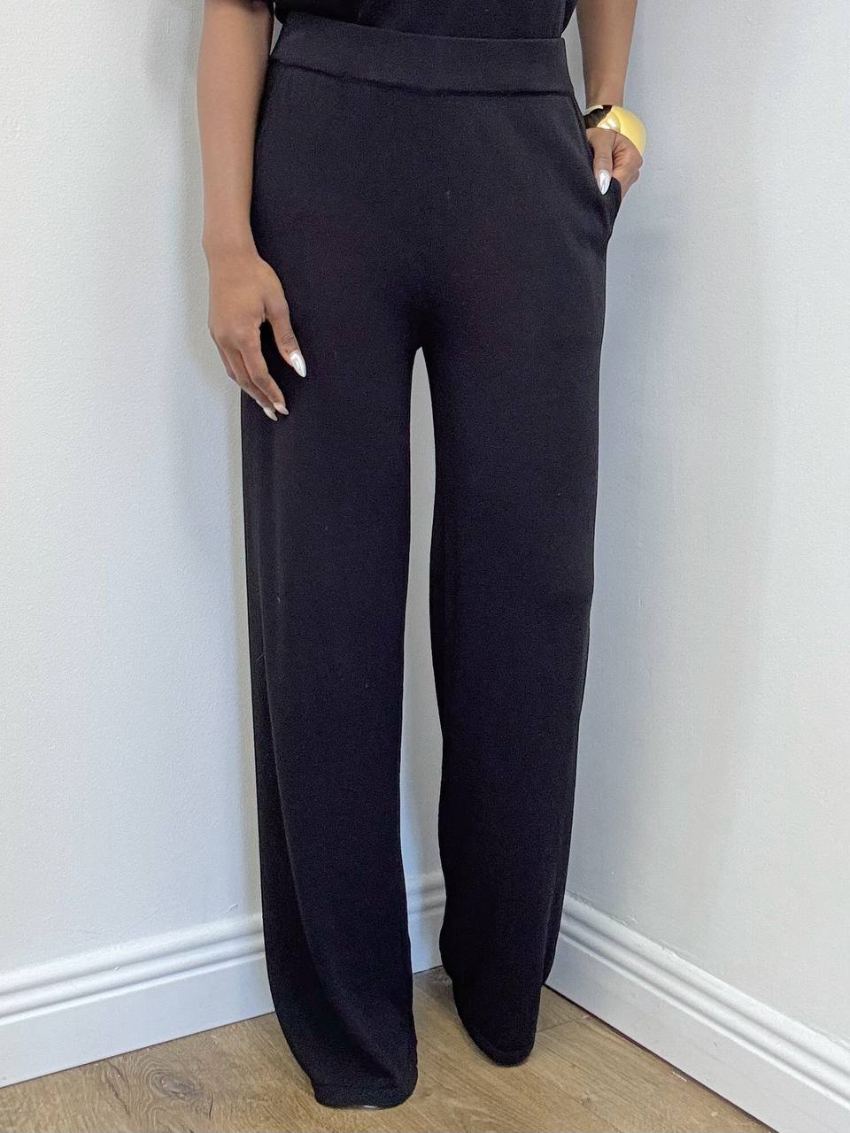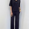 Il pantalone a palazzo completa l’insieme con una silhouette ampia e ariosa. La vita elasticizzata assicura comfort e adattabilità, mentre il taglio morbido slancia la figura donando un effetto elegante e rilassato. Le taschine laterali aggiungono un dettaglio funzionale e discreto, perfetto per un capo pratico ma sempre raffinato.