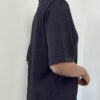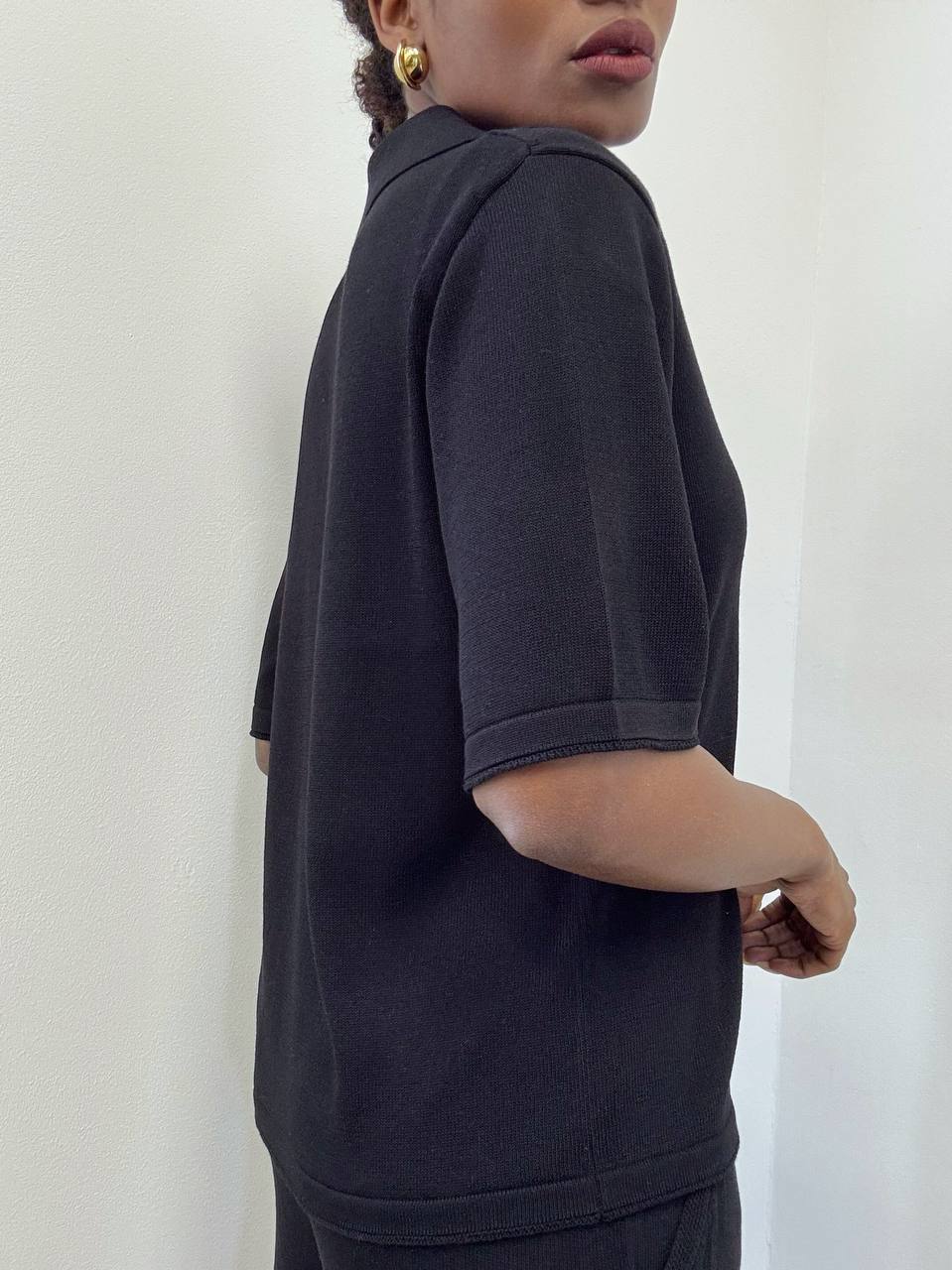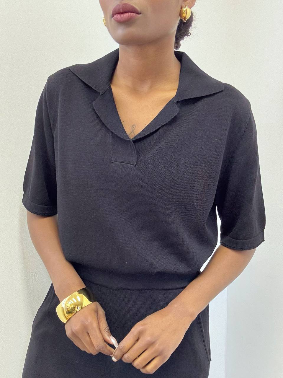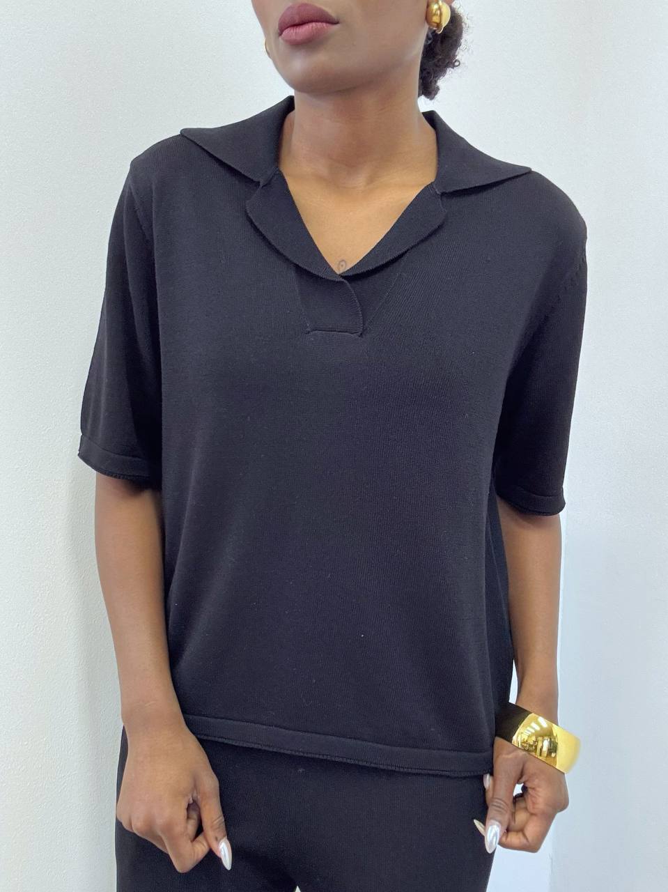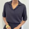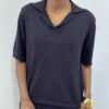 La polo a maniche corte presenta uno scollo a V che valorizza il décolleté con semplicità e femminilità. La linea è essenziale ma curata, con una struttura elasticizzata che segue delicatamente le forme senza costringere, rendendola ideale sia per look casual che più ricercati.