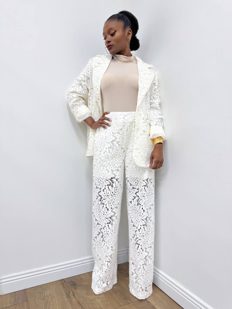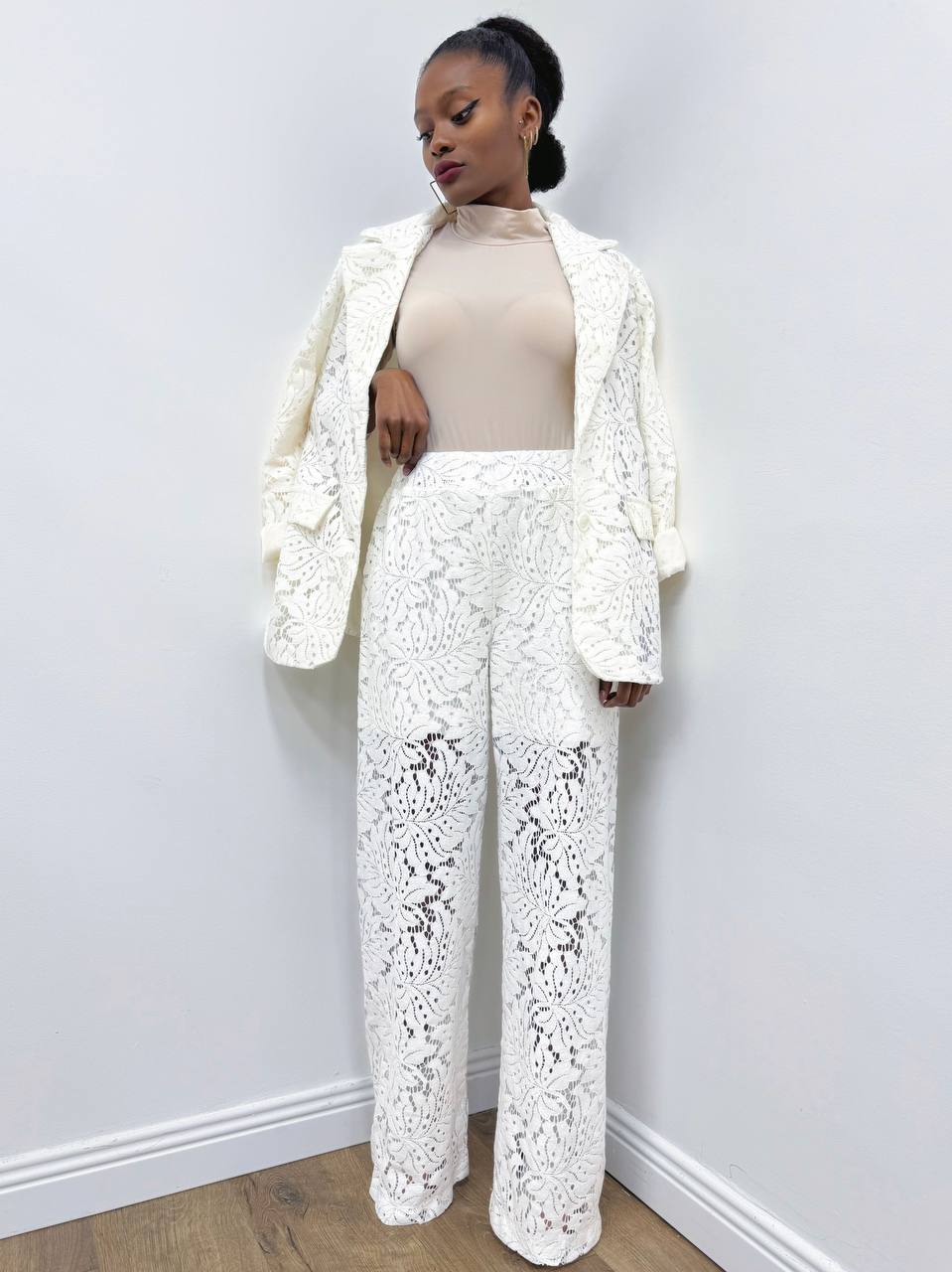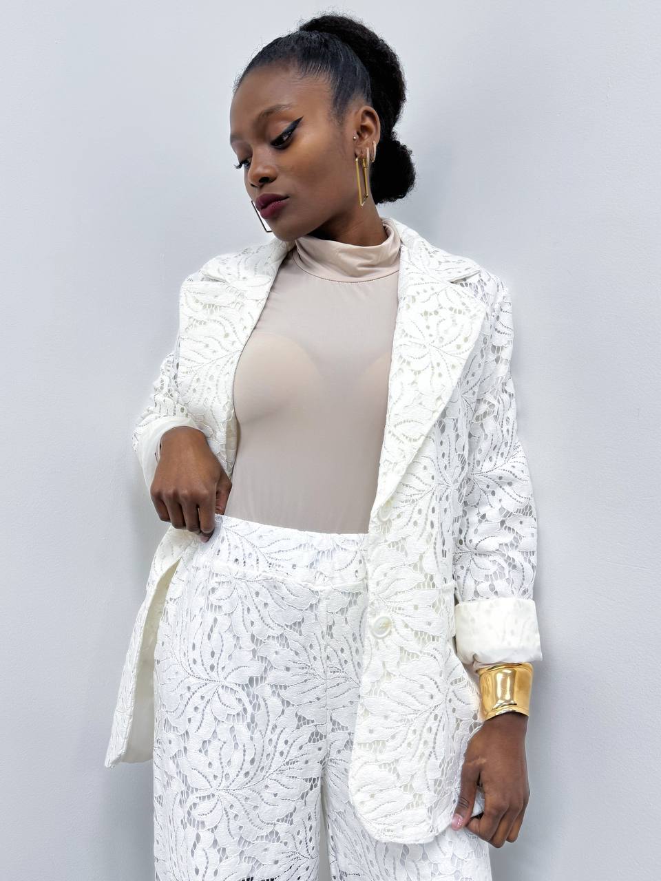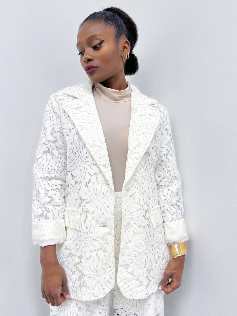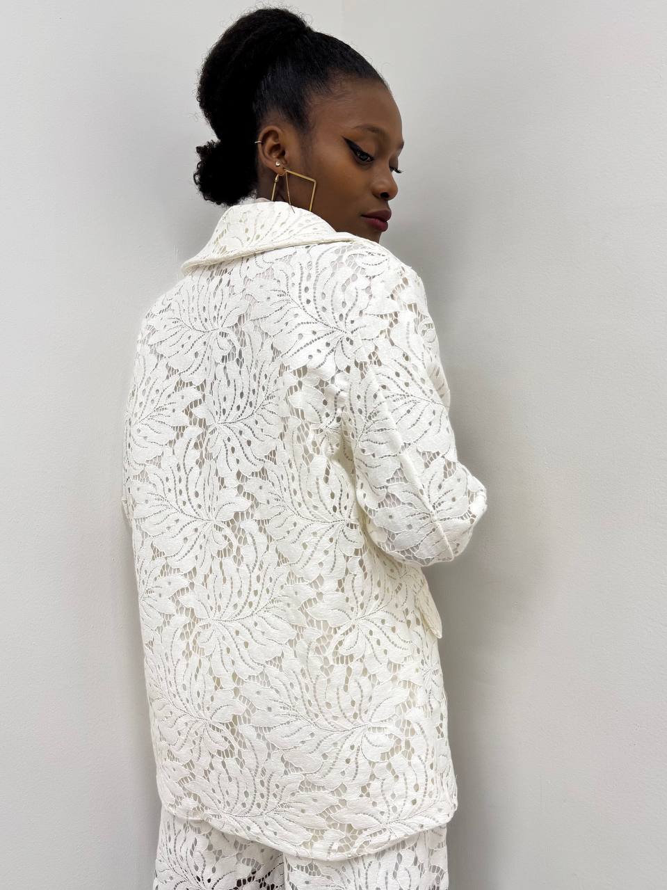 Giacca Monobottone completamente in pizzo con dettaglio di taschine. Foderata internamente