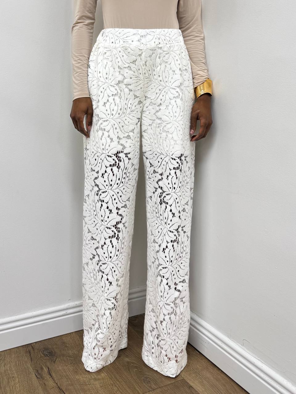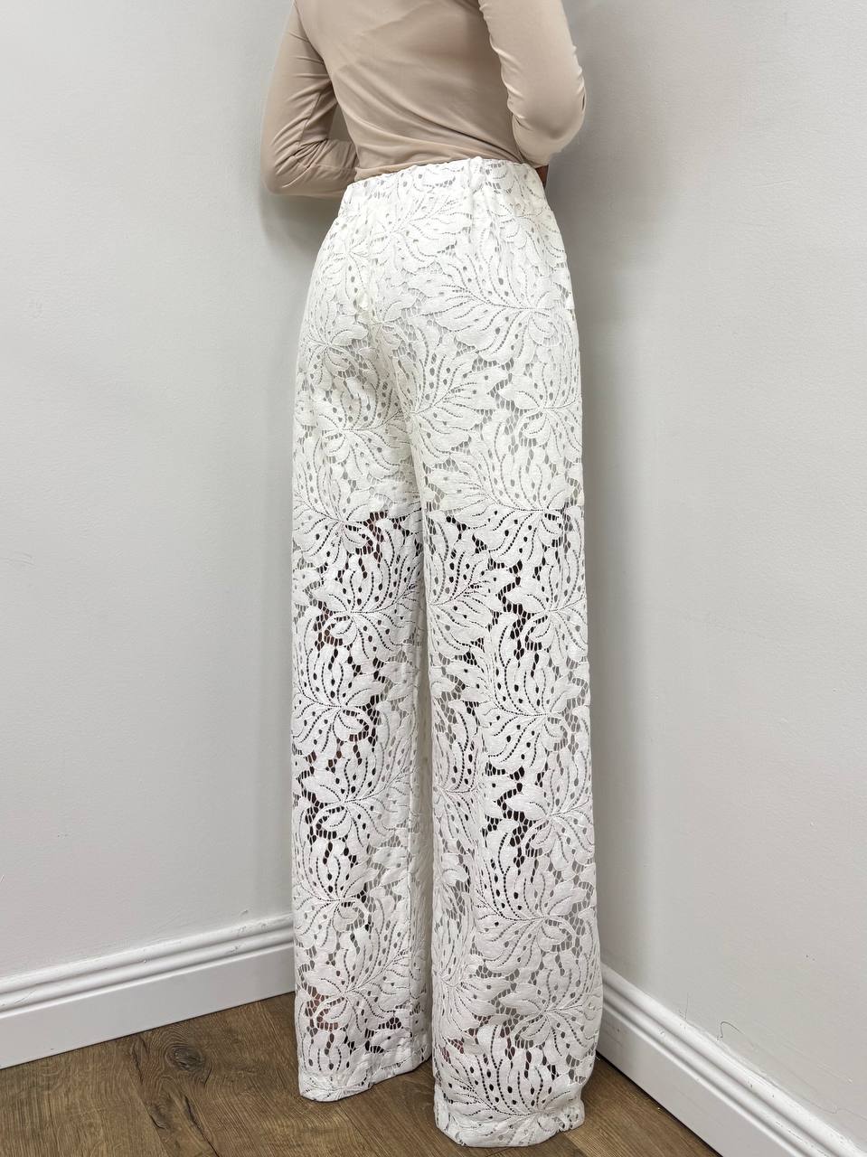 Pantalone elasticizzato sul punto vita completamente in pizzo a gamba larga .Foderata internamente.