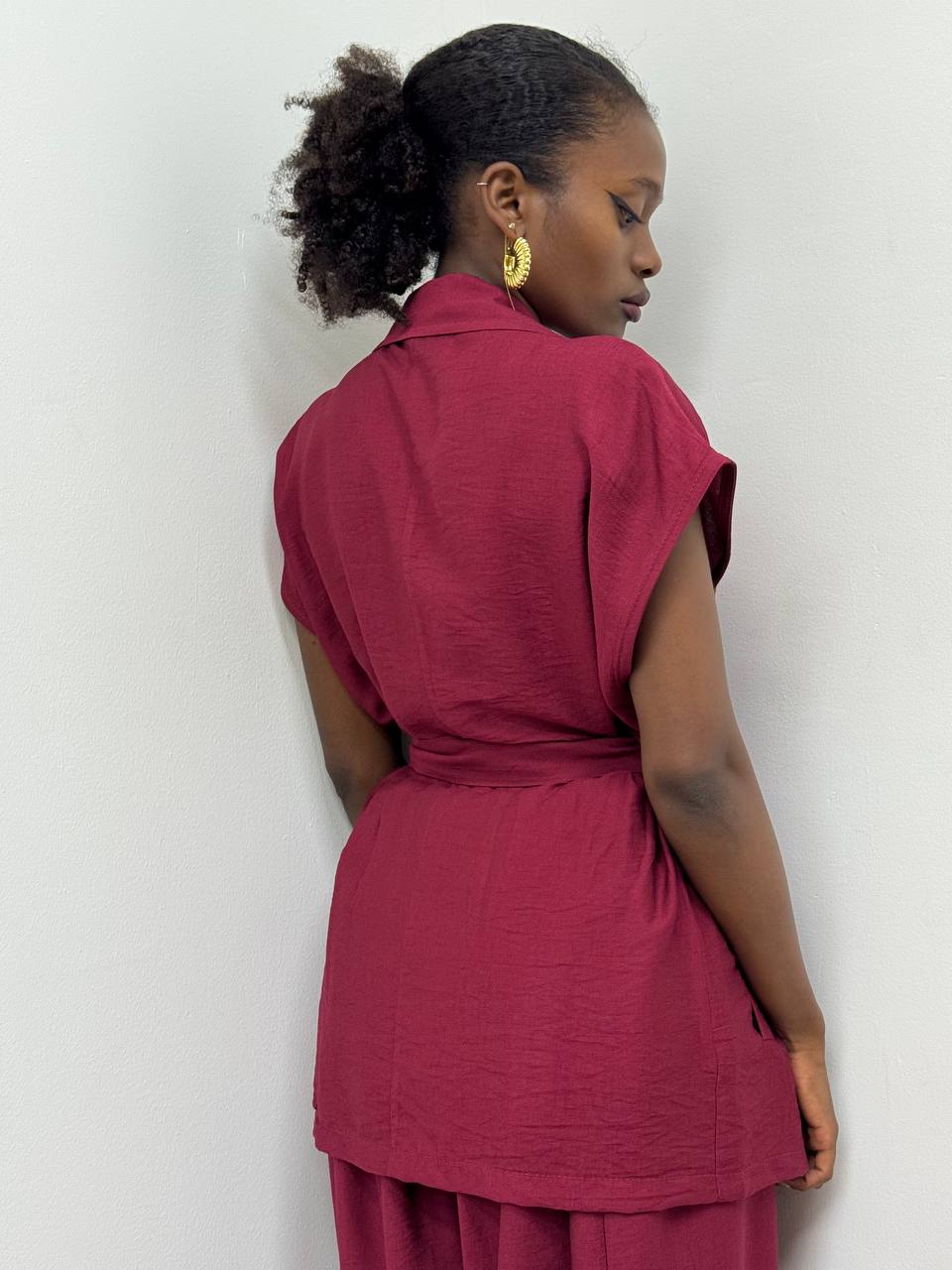 Casacca smanicata con fusciacca rivestita in tessuto sul punto vita e taschine a tinta unita. Chiusura con bottone centrale