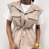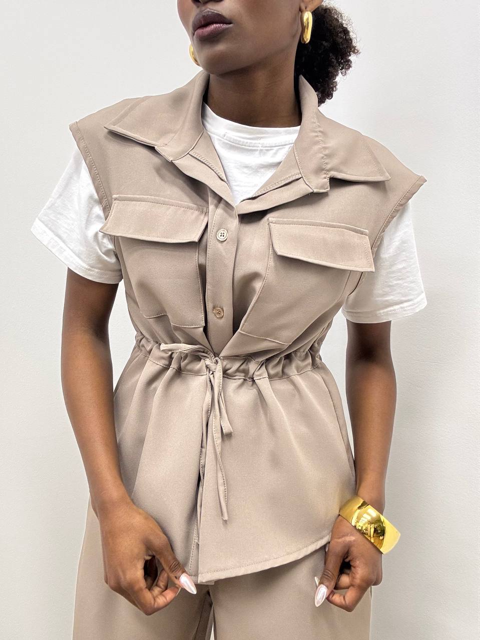 La camicetta smanicata presenta un taglio leggero e femminile, arricchito da finte taschine centrali che donano un tocco di stile. L’elasticizzazione in vita valorizza la silhouette, garantendo al tempo stesso comfort e vestibilità.