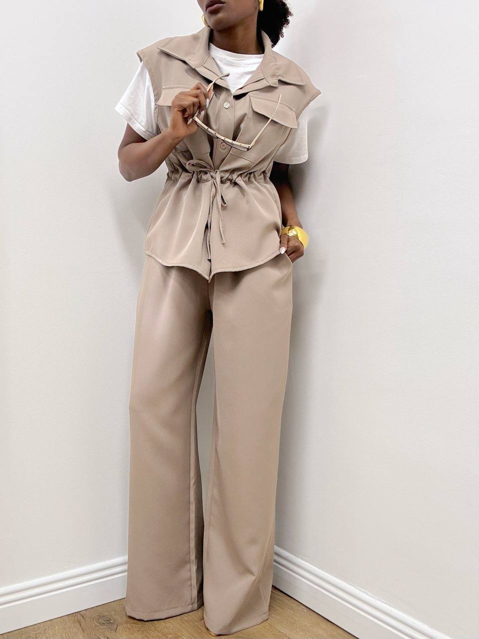 Completo dal design moderno e versatile, composto da camicetta smanicata e pantalone abbinato, perfetto per creare look curati con il minimo sforzo.