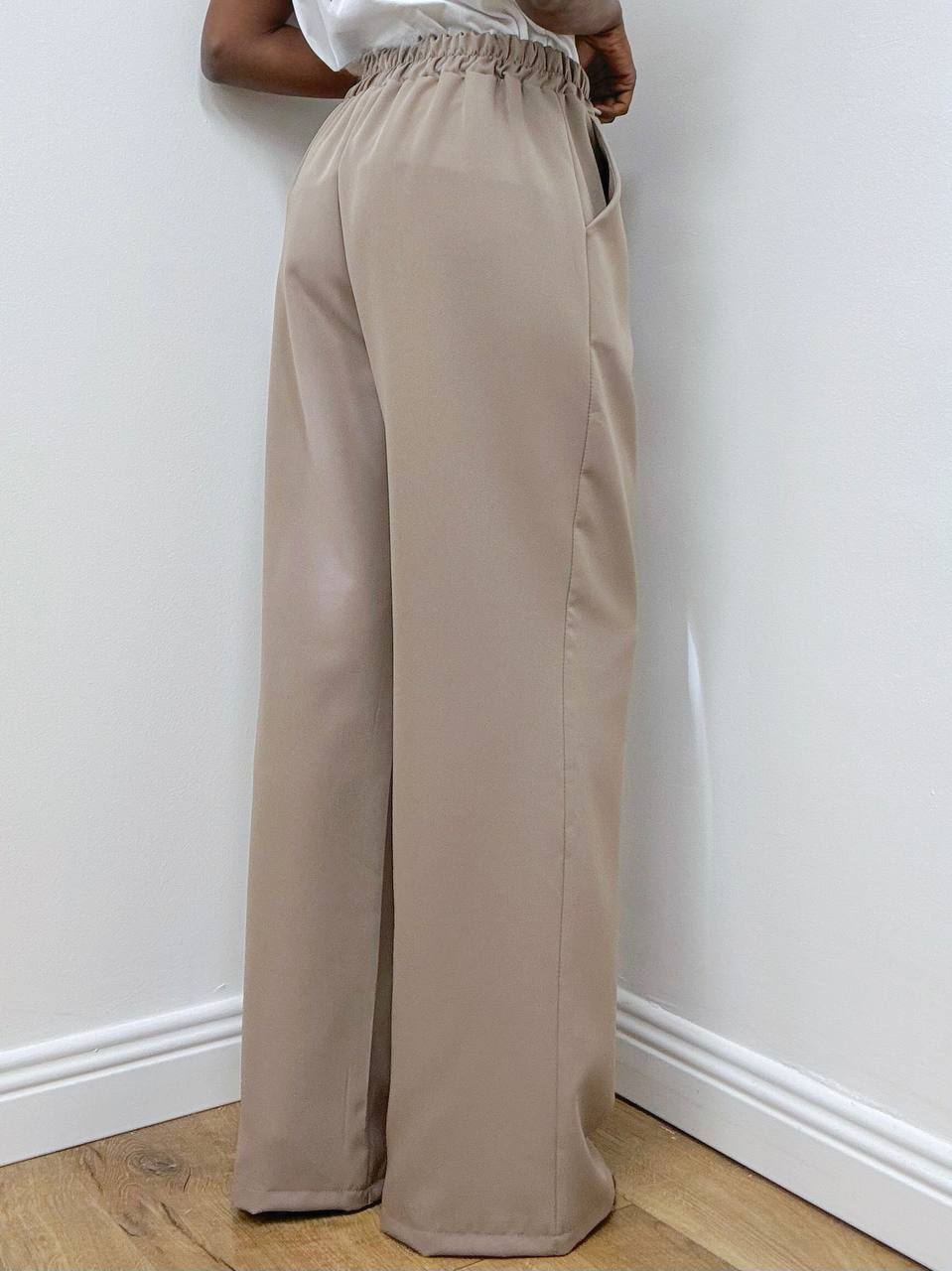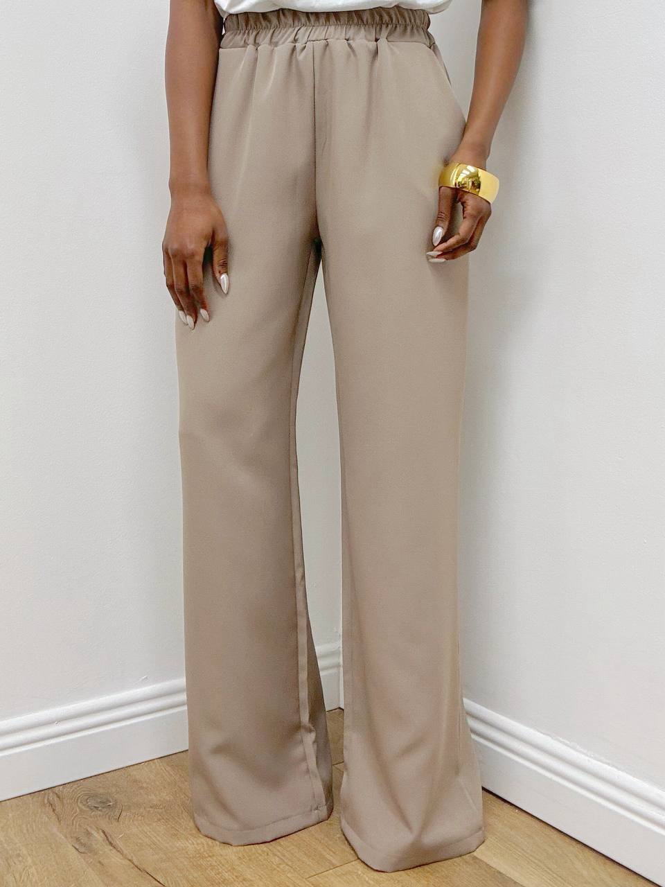 Il pantalone coordinato è caratterizzato da vita elasticizzata per una perfetta aderenza e praticità. Il modello è leggermente a palazzo, con taschine laterali che aggiungono funzionalità e un dettaglio casual-chic.
