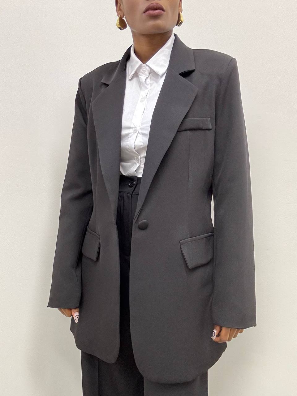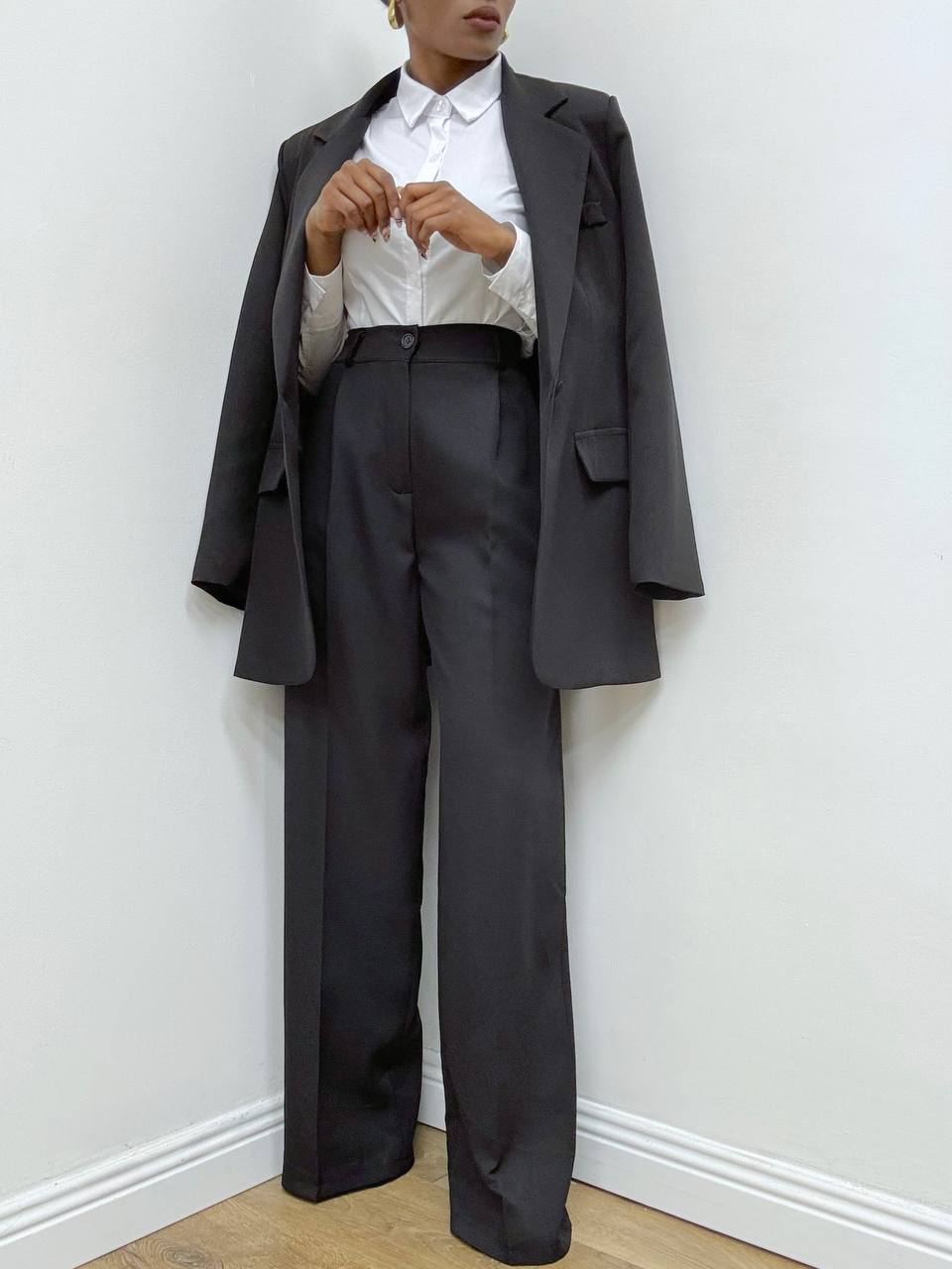 Completo raffinato dal taglio contemporaneo, composto da giacca monopetto con chiusura a un bottone, pensata per valorizzare la silhouette con linee pulite e strutturate. Il modello presenta due patte laterali che aggiungono un tocco classico e sofisticato, bilanciando perfettamente modernità ed eleganza. La vestibilità è studiata per risultare femminile ma confortevole, ideale sia per contesti formali che per look più ricercati da giorno.