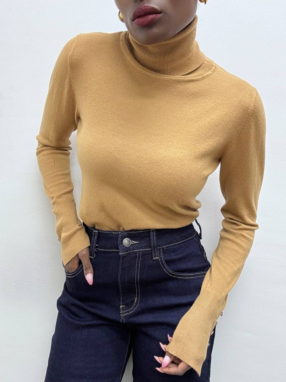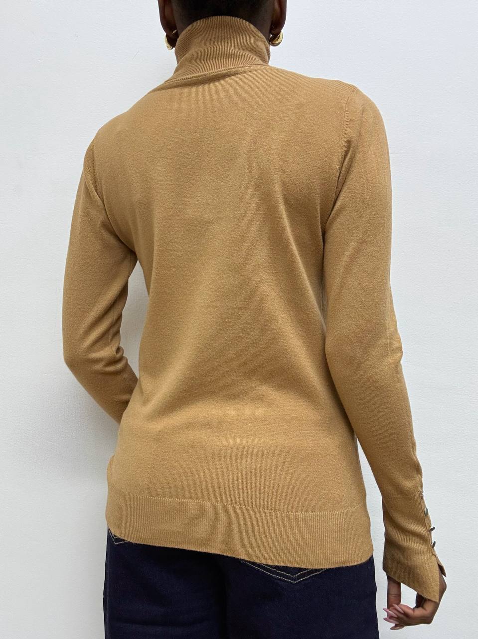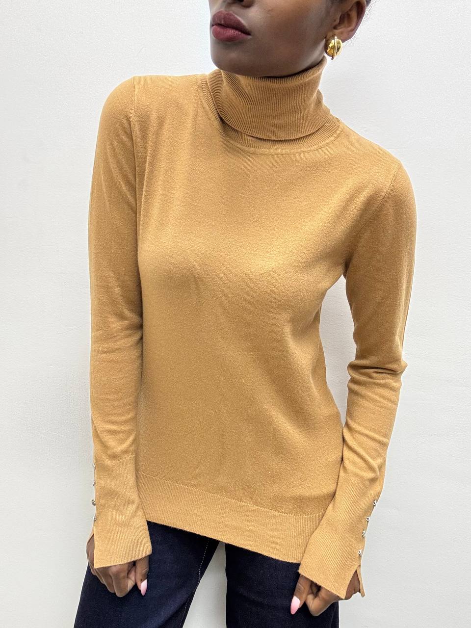 Questo dolcevita è elegante e minimal,è realizzato in tessuto elasticizzato che assicura una vestibilità comoda e aderente. Il design classico del collo alto è arricchito da un raffinato dettaglio: quattro mini bottoncini applicati sui polsini, che donano un tocco femminile e ricercato. Un capo versatile, perfetto da indossare da solo o sotto giacche e blazer, ideale per completare look casual chic o più formali.