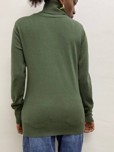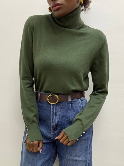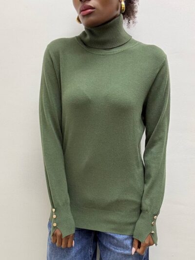 Questo dolcevita è elegante e minimal,è realizzato in tessuto elasticizzato che assicura una vestibilità comoda e aderente. Il design classico del collo alto è arricchito da un raffinato dettaglio: tre mini bottoncini applicati sui polsini, che donano un tocco femminile e ricercato. Un capo versatile, perfetto da indossare da solo o sotto giacche e blazer, ideale per completare look casual chic o più formali.