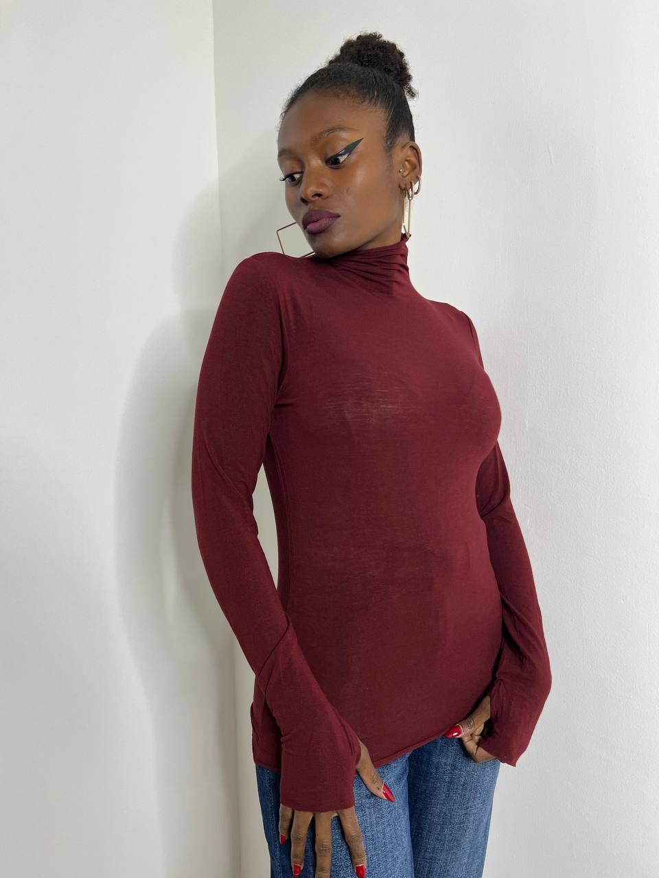 Dolcevita a tinta unita elasticizzato con dettaglio di guanto sul polsino.