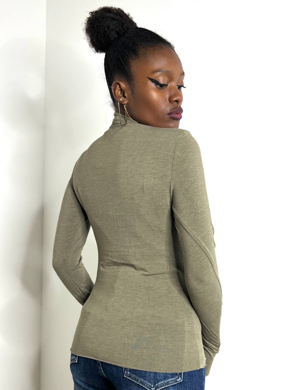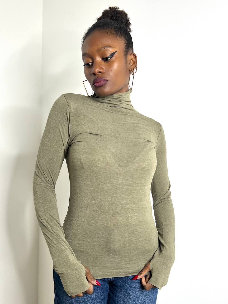 Dolcevita a tinta unita elasticizzato con dettaglio di guanto sul polsino.