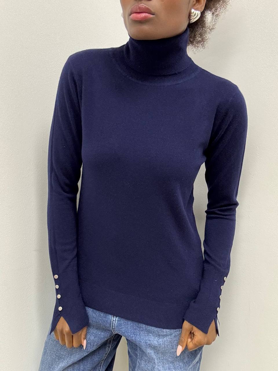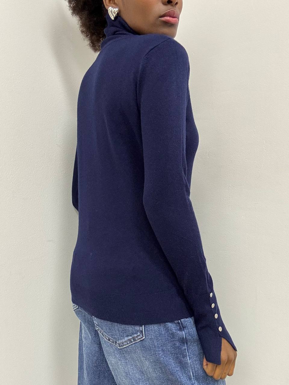 Questo dolcevita è elegante e minimal,è realizzato in tessuto elasticizzato che assicura una vestibilità comoda e aderente. Il design classico del collo alto è arricchito da un raffinato dettaglio: tre mini bottoncini applicati sui polsini, che donano un tocco femminile e ricercato. Un capo versatile, perfetto da indossare da solo o sotto giacche e blazer, ideale per completare look casual chic o più formali.