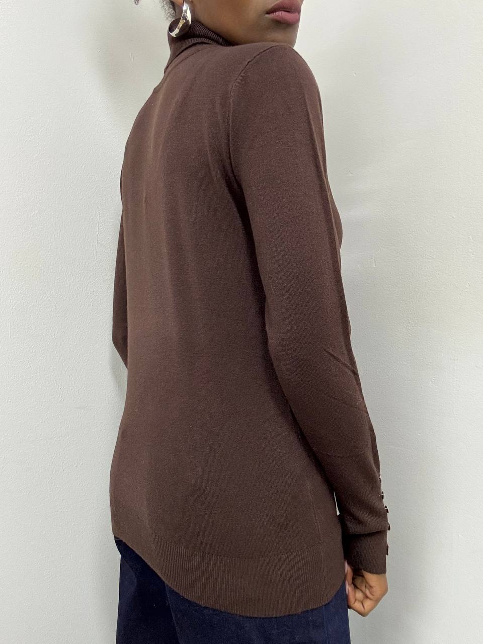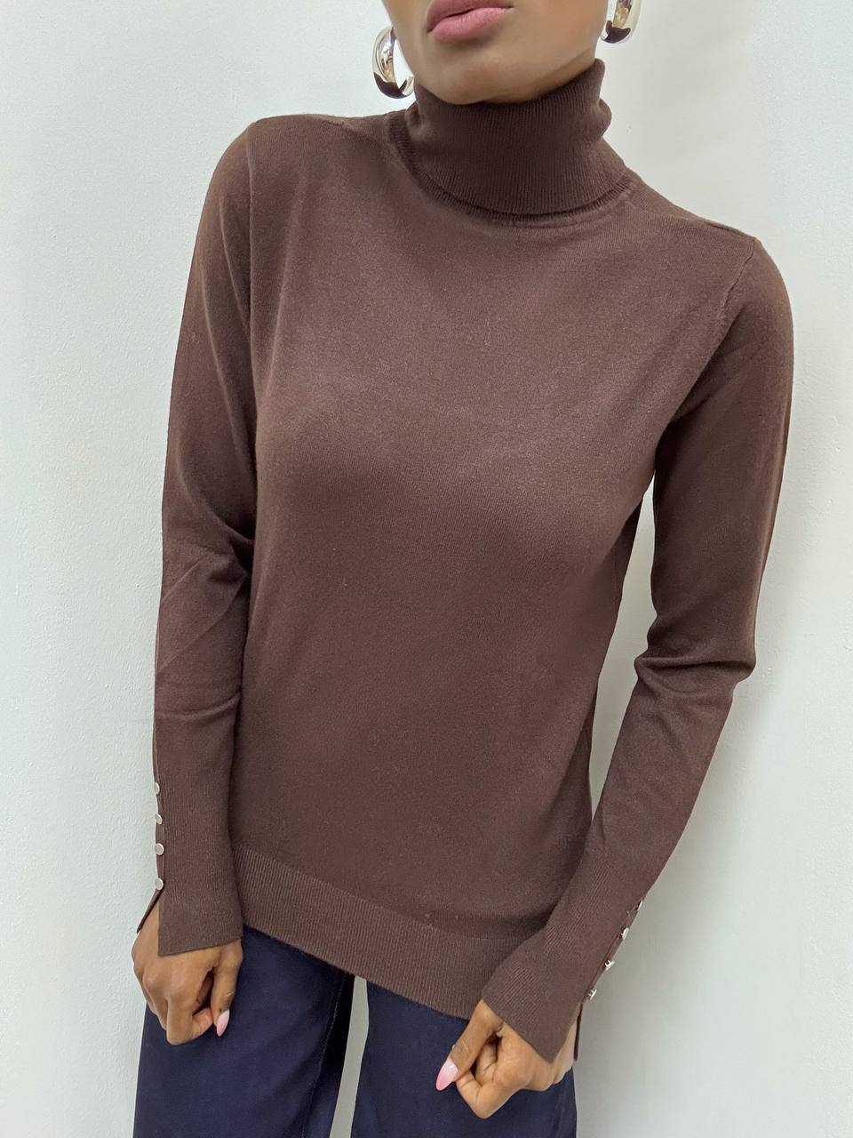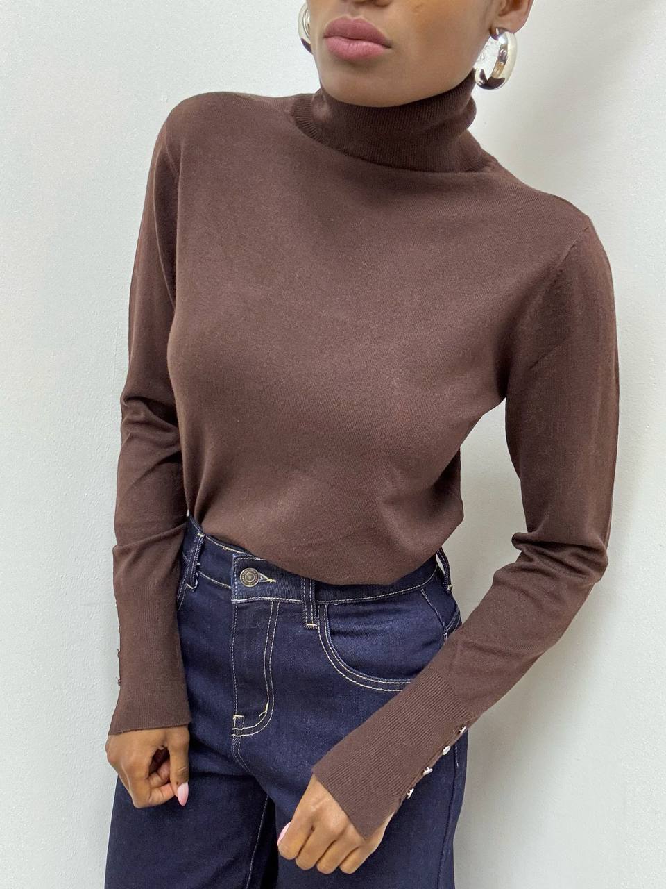 Questo dolcevita è elegante e minimal,è realizzato in tessuto elasticizzato che assicura una vestibilità comoda e aderente. Il design classico del collo alto è arricchito da un raffinato dettaglio: quattro mini bottoncini applicati sui polsini, che donano un tocco femminile e ricercato. Un capo versatile, perfetto da indossare da solo o sotto giacche e blazer, ideale per completare look casual chic o più formali.