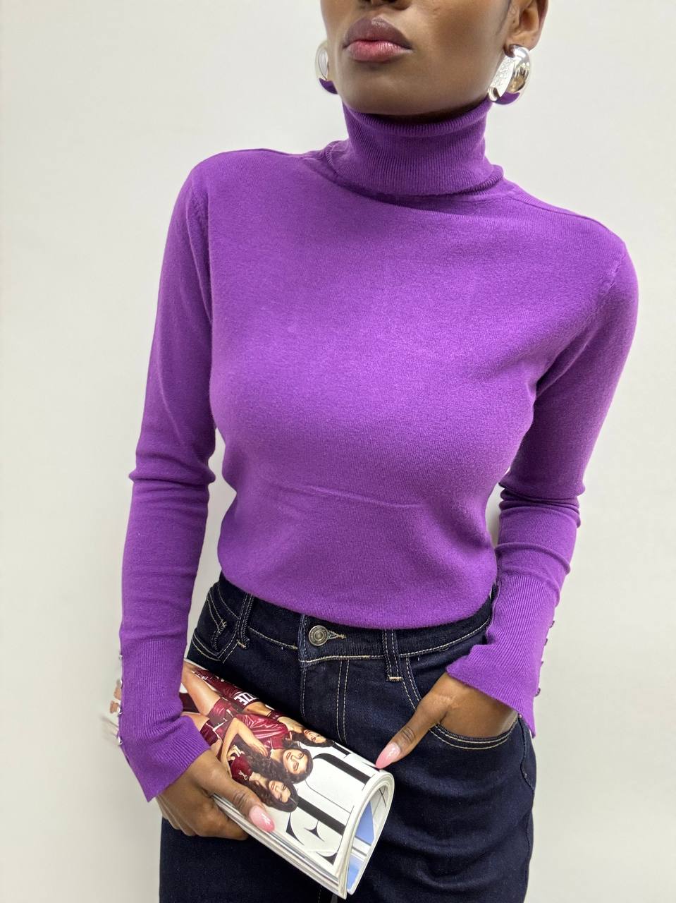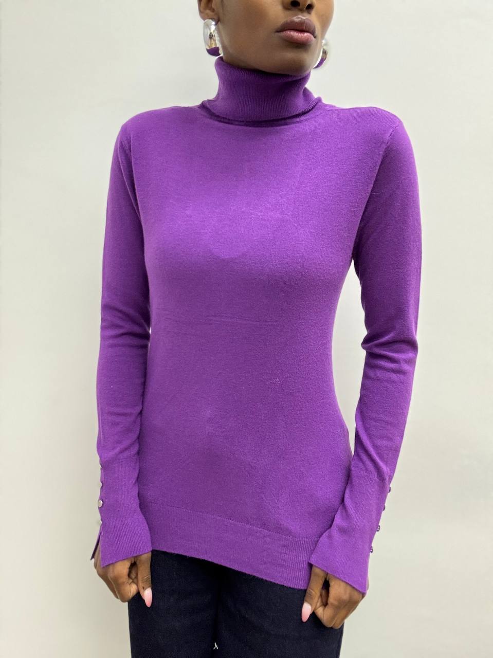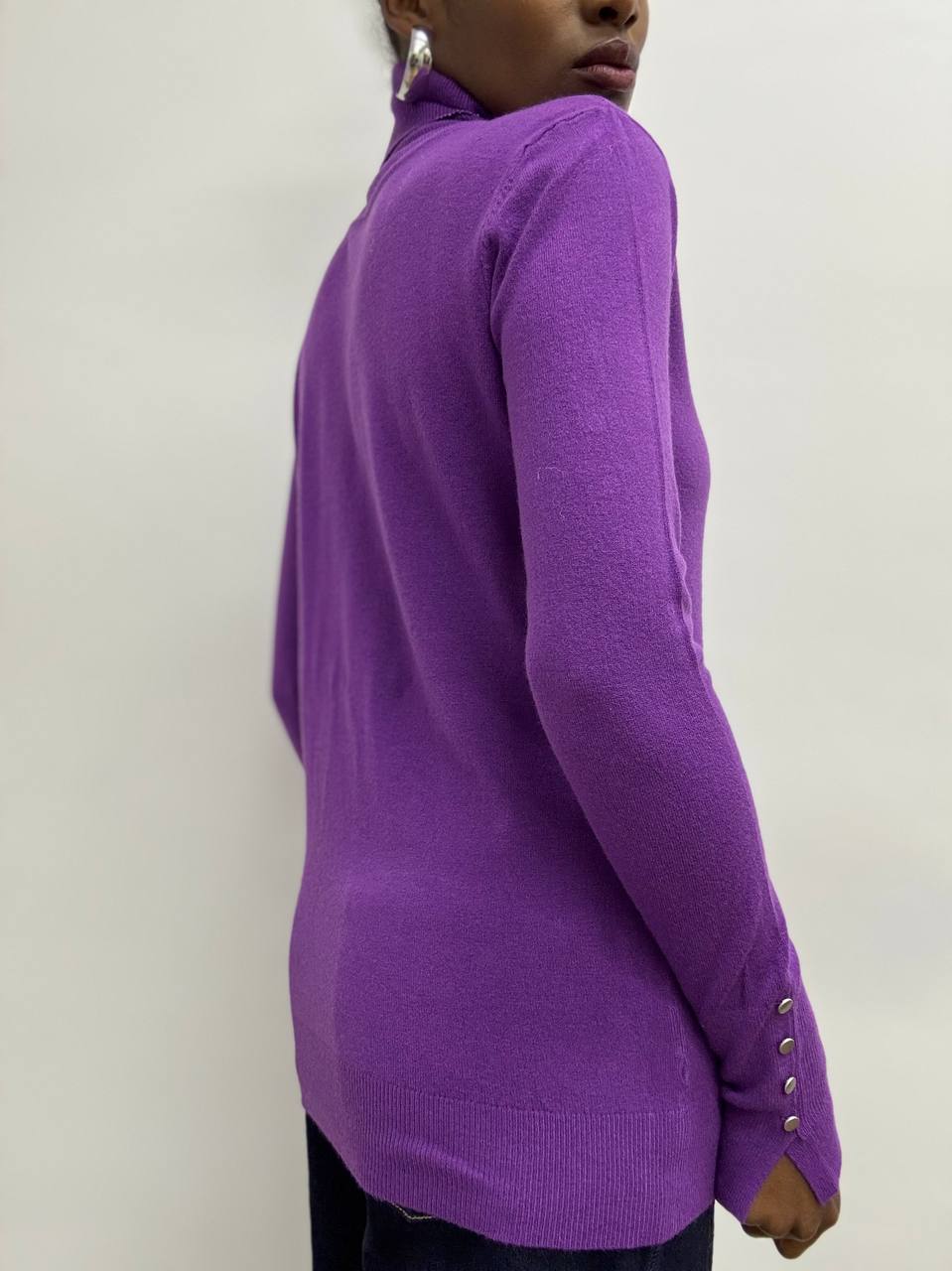 Questo dolcevita è elegante e minimal,è realizzato in tessuto elasticizzato che assicura una vestibilità comoda e aderente. Il design classico del collo alto è arricchito da un raffinato dettaglio: tre mini bottoncini applicati sui polsini, che donano un tocco femminile e ricercato. Un capo versatile, perfetto da indossare da solo o sotto giacche e blazer, ideale per completare look casual chic o più formali.