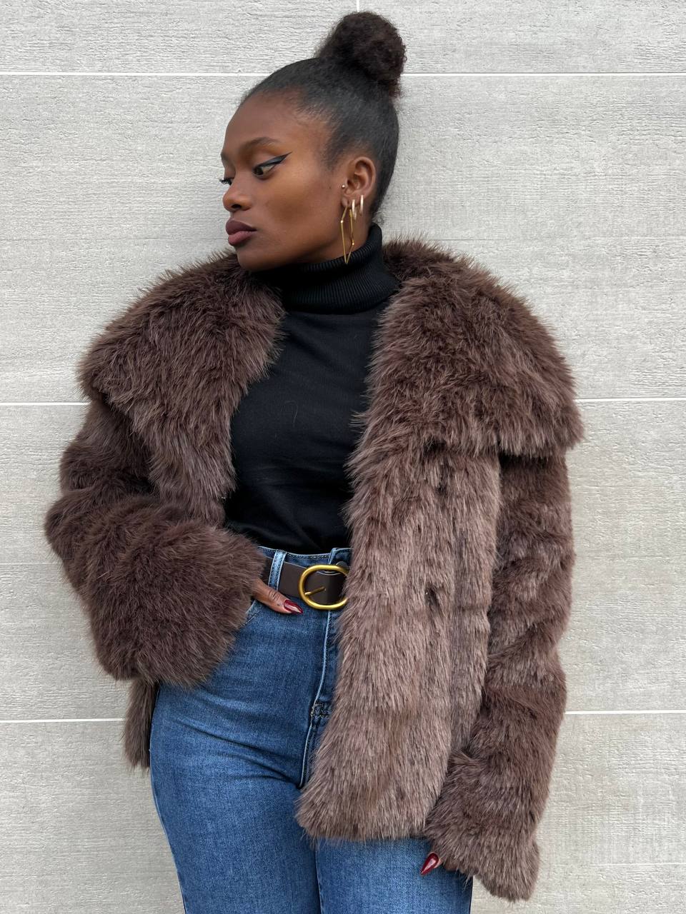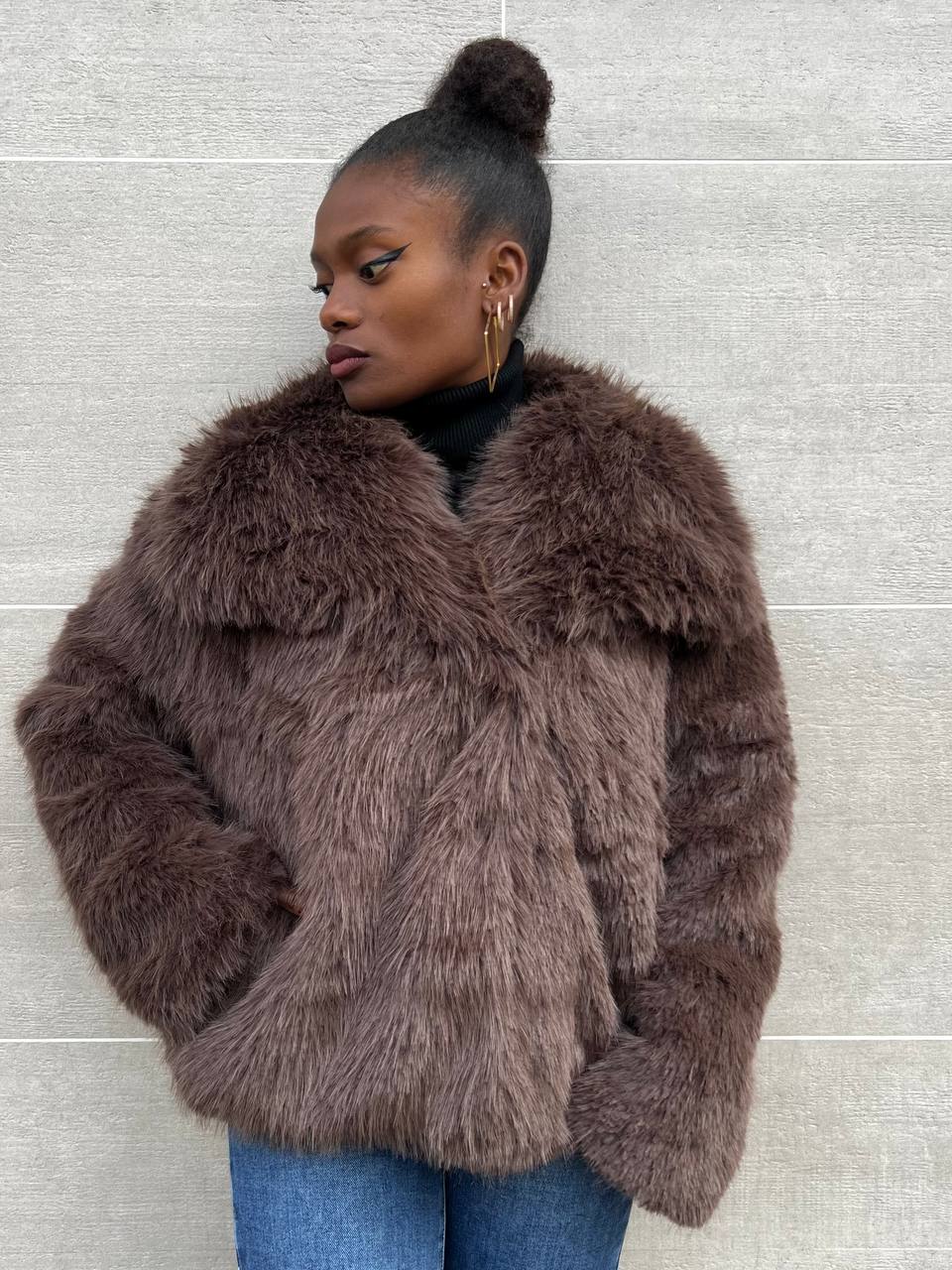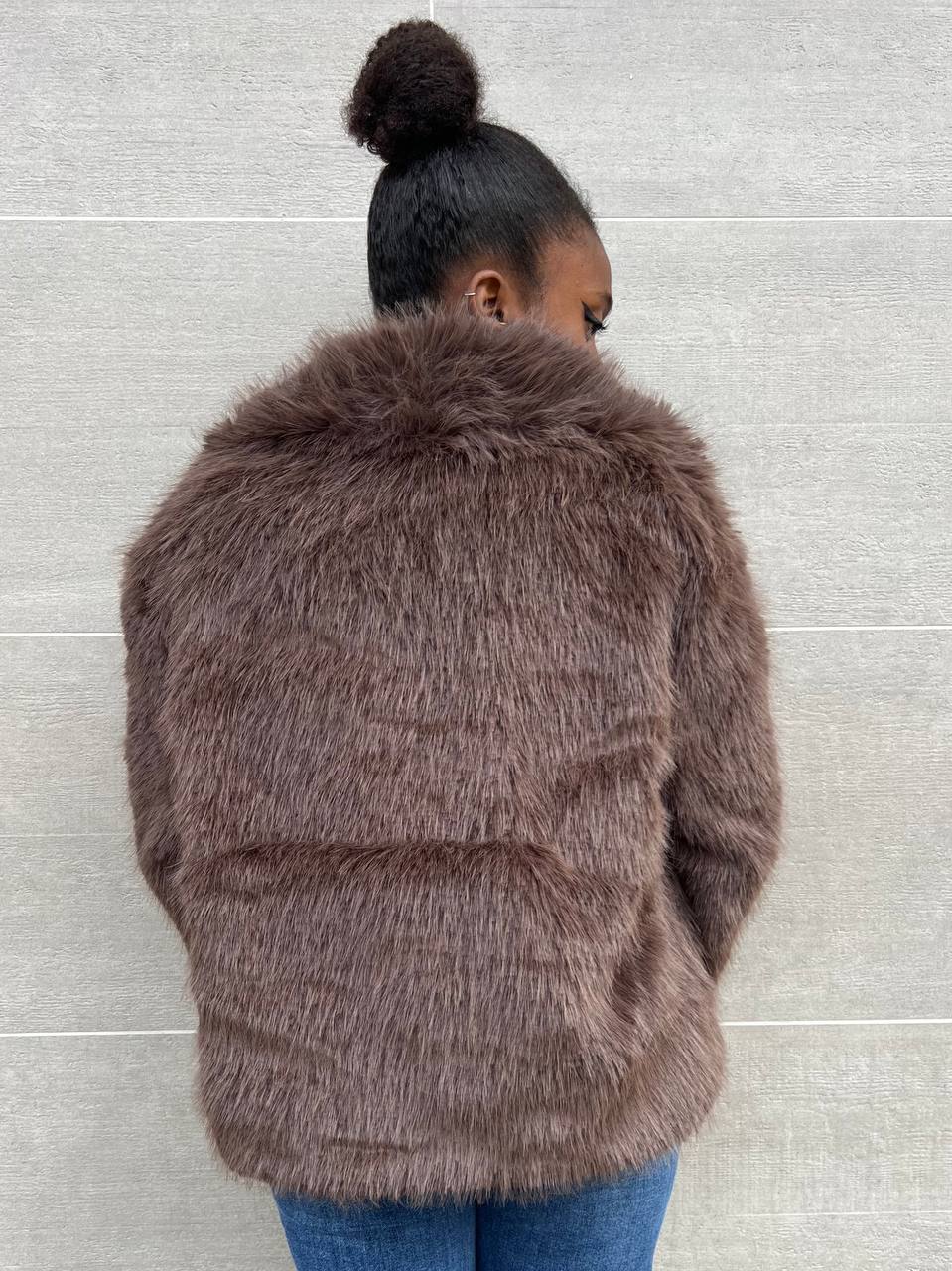Ecofur a tinta unita con dettaglio di bottone di chiusura a clip con dettaglio di taschine laterali.