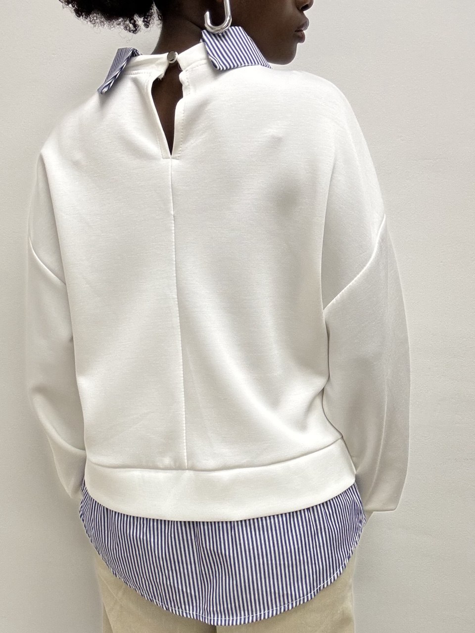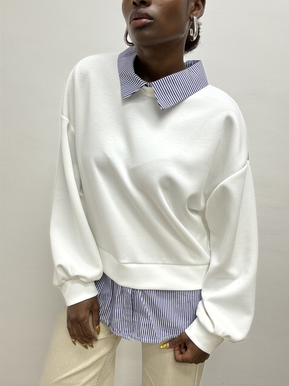 Felpa dallo stile contemporaneo con dettagli sartoriali. Realizzata in tessuto elasticizzato per garantire massimo comfort e libertà di movimento, questa felpa si distingue per gli inserti di camicia a contrasto che aggiungono un tocco elegante e originale al capo. Il collo e i polsini camicia donano un effetto layering raffinato, perfetto per look casual-chic o per sdrammatizzare outfit più formali.