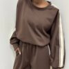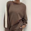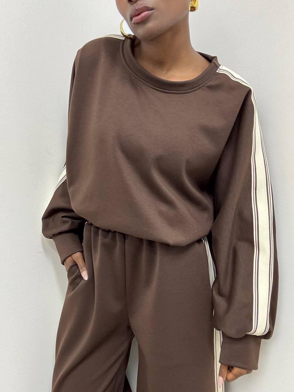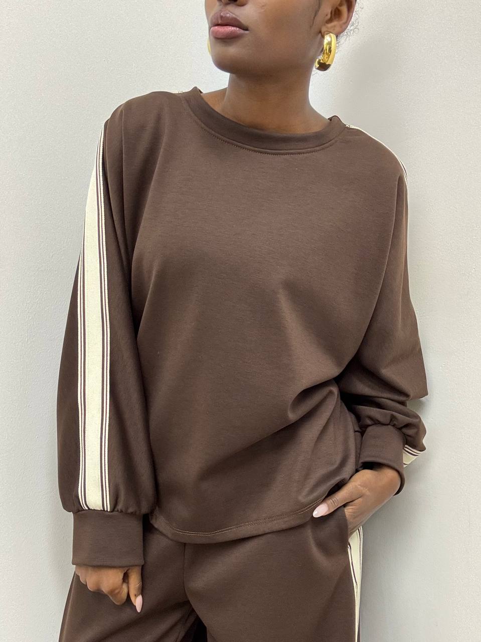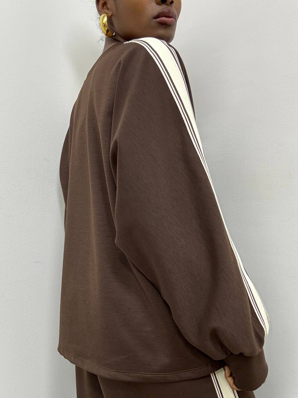 Casual ma ricercata, questa felpa presenta un taglio ampio che assicura comfort e libertà di movimento. Il girocollo classico e i polsini elasticizzati donano una vestibilità morbida ma curata. A rendere unico il design sono le strisce decorative verticali in bianco e beige, che si estendono dalle spalle fino ai polsini, aggiungendo un tocco dinamico e contemporaneo al capo. Perfetta per un look sportivo-chic dal carattere distintivo.