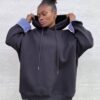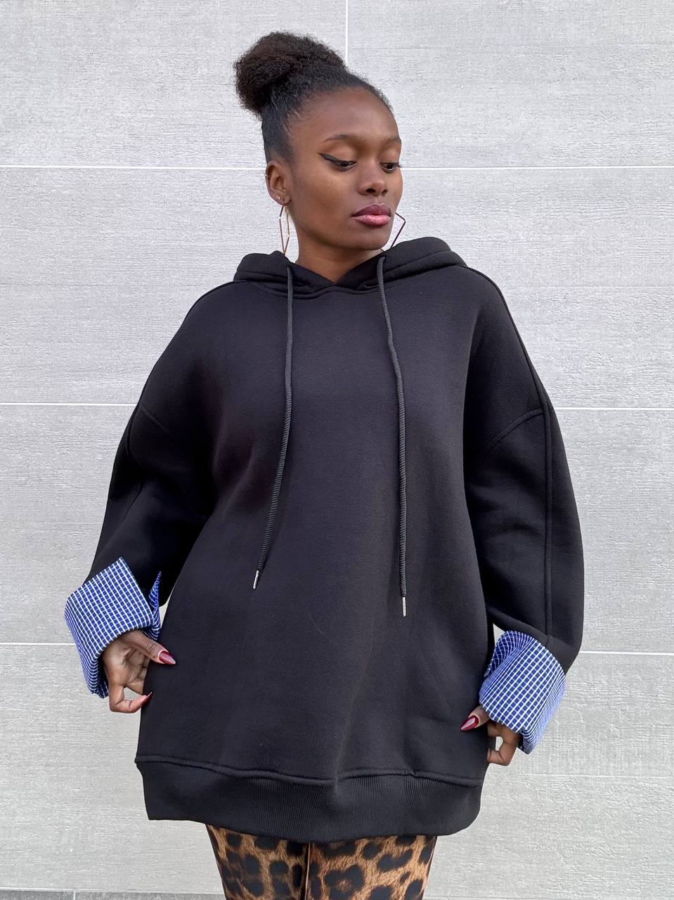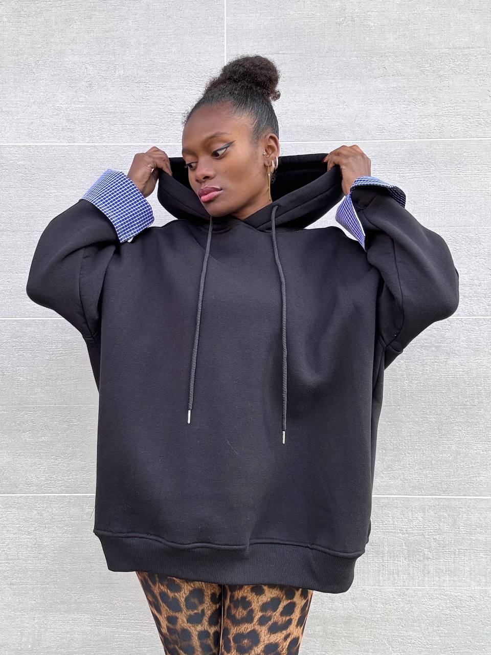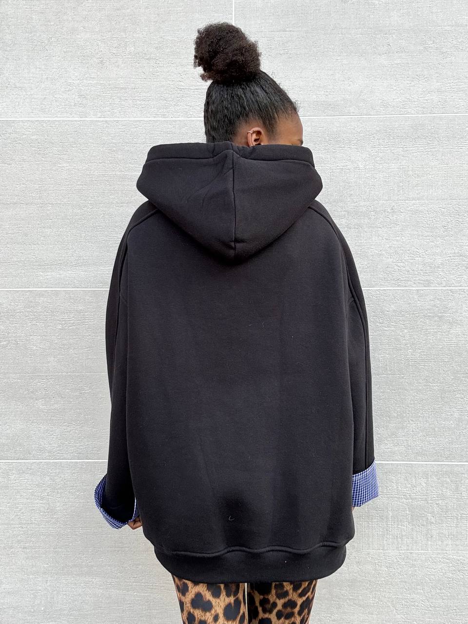 Felpa a tinta unita con dettaglio polsino con tessuto camicia. Interno con pile con cappuccio.