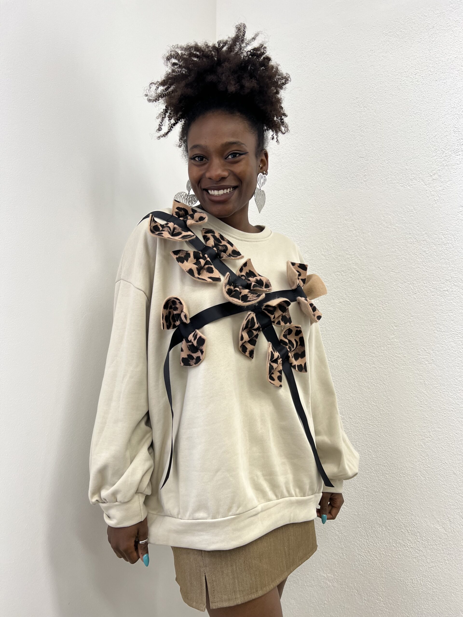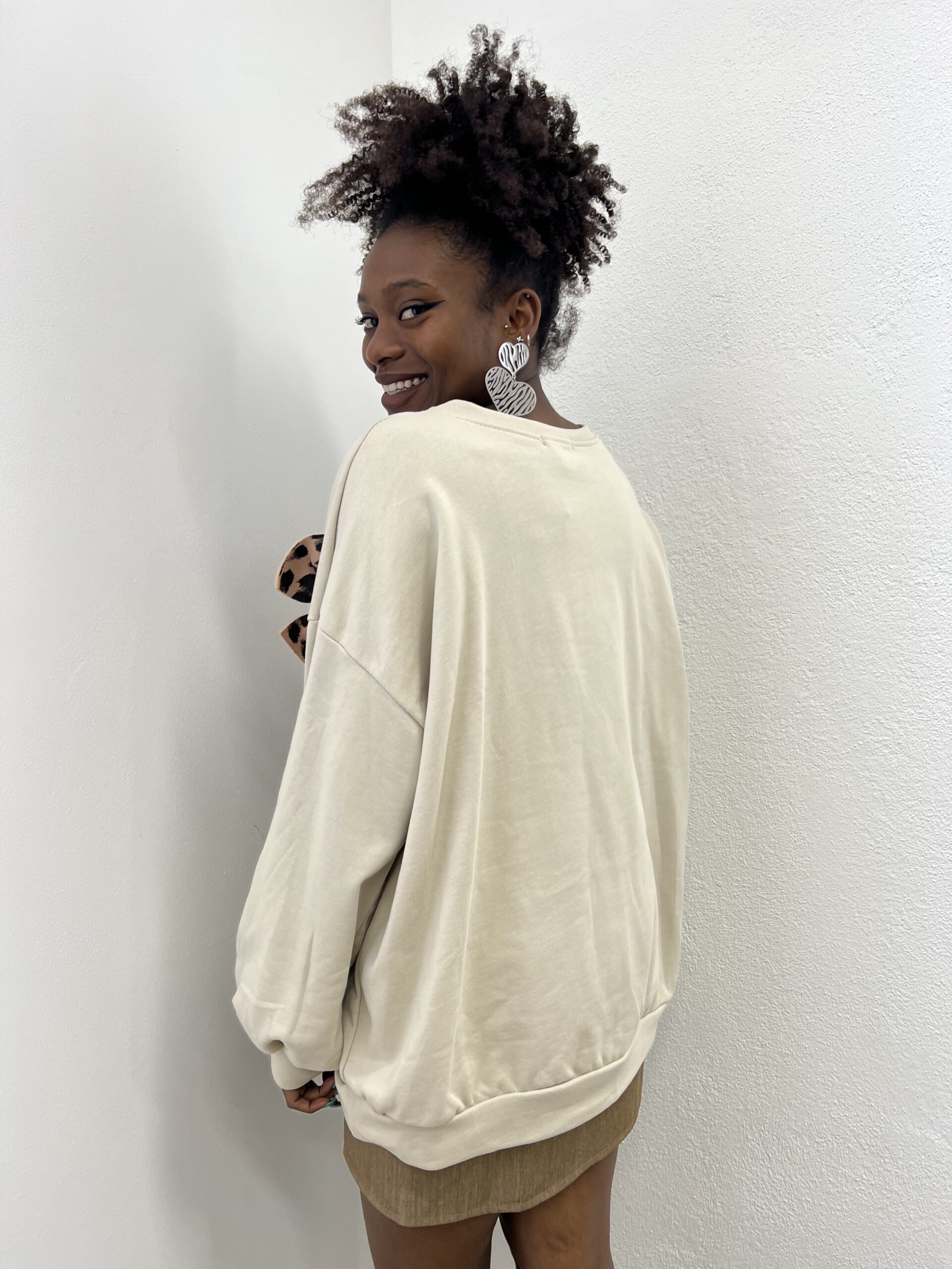 Felpa garzata con dettaglio di fiocco in rilievo leopardato. Elasticizzata.