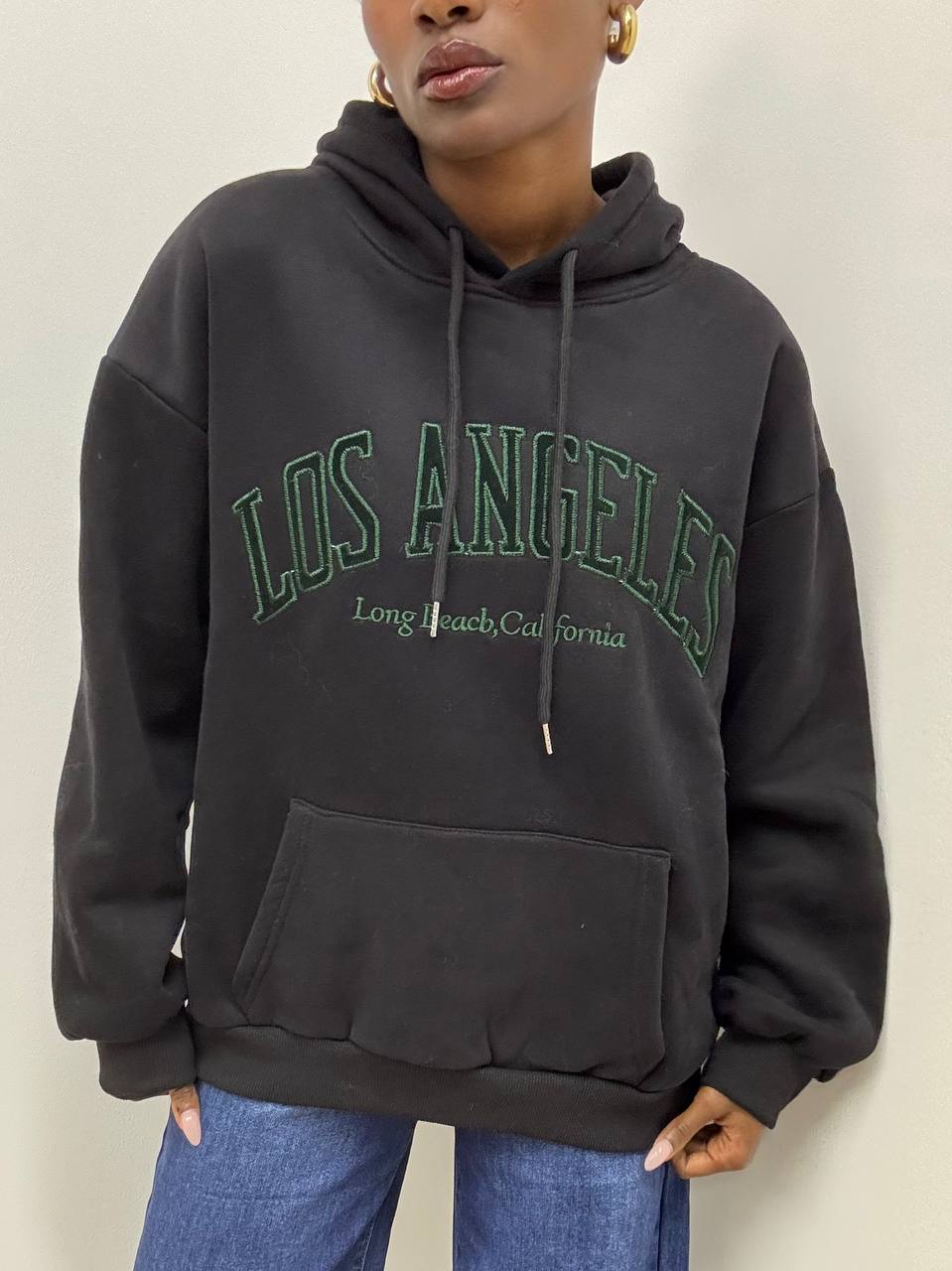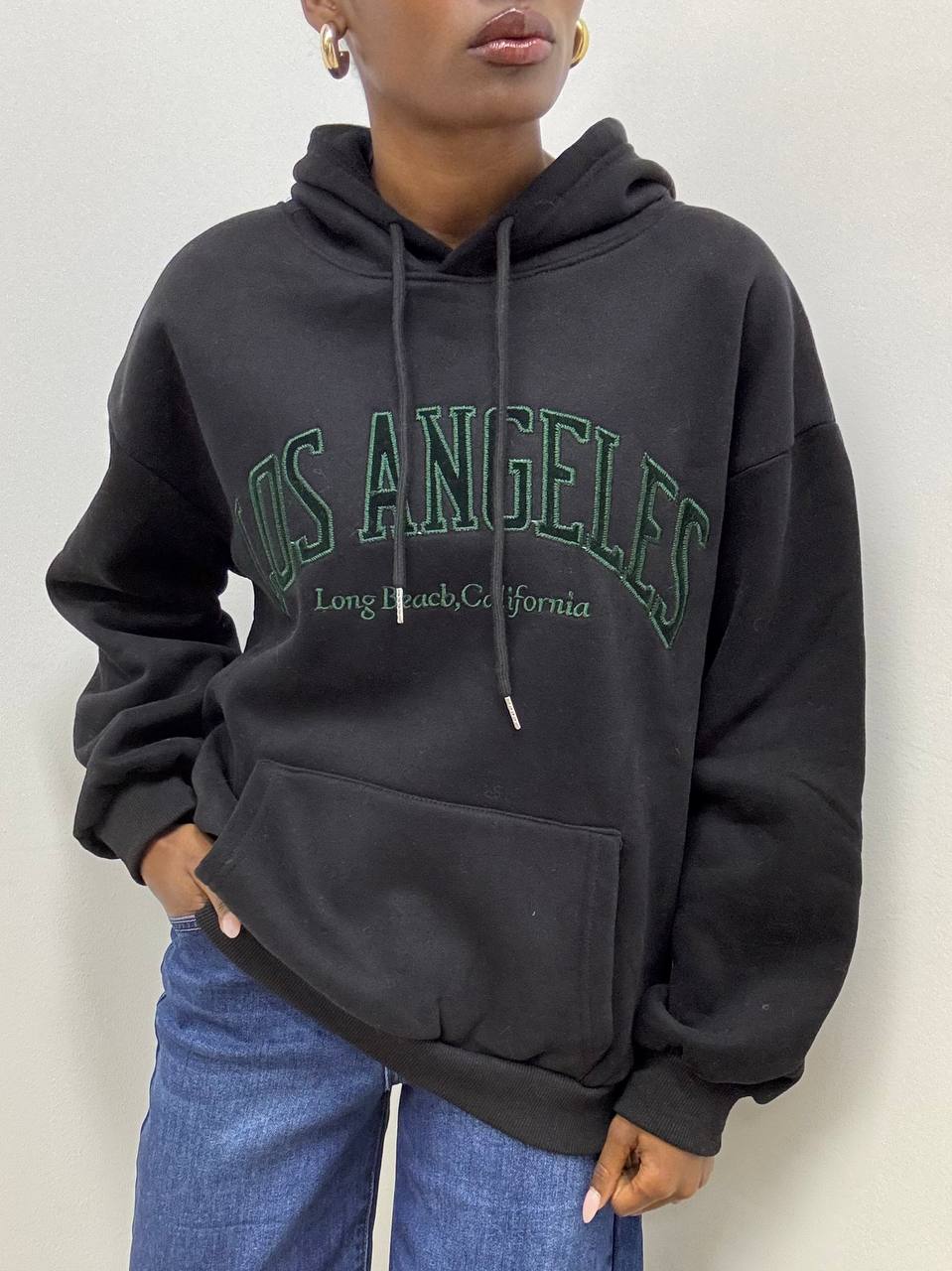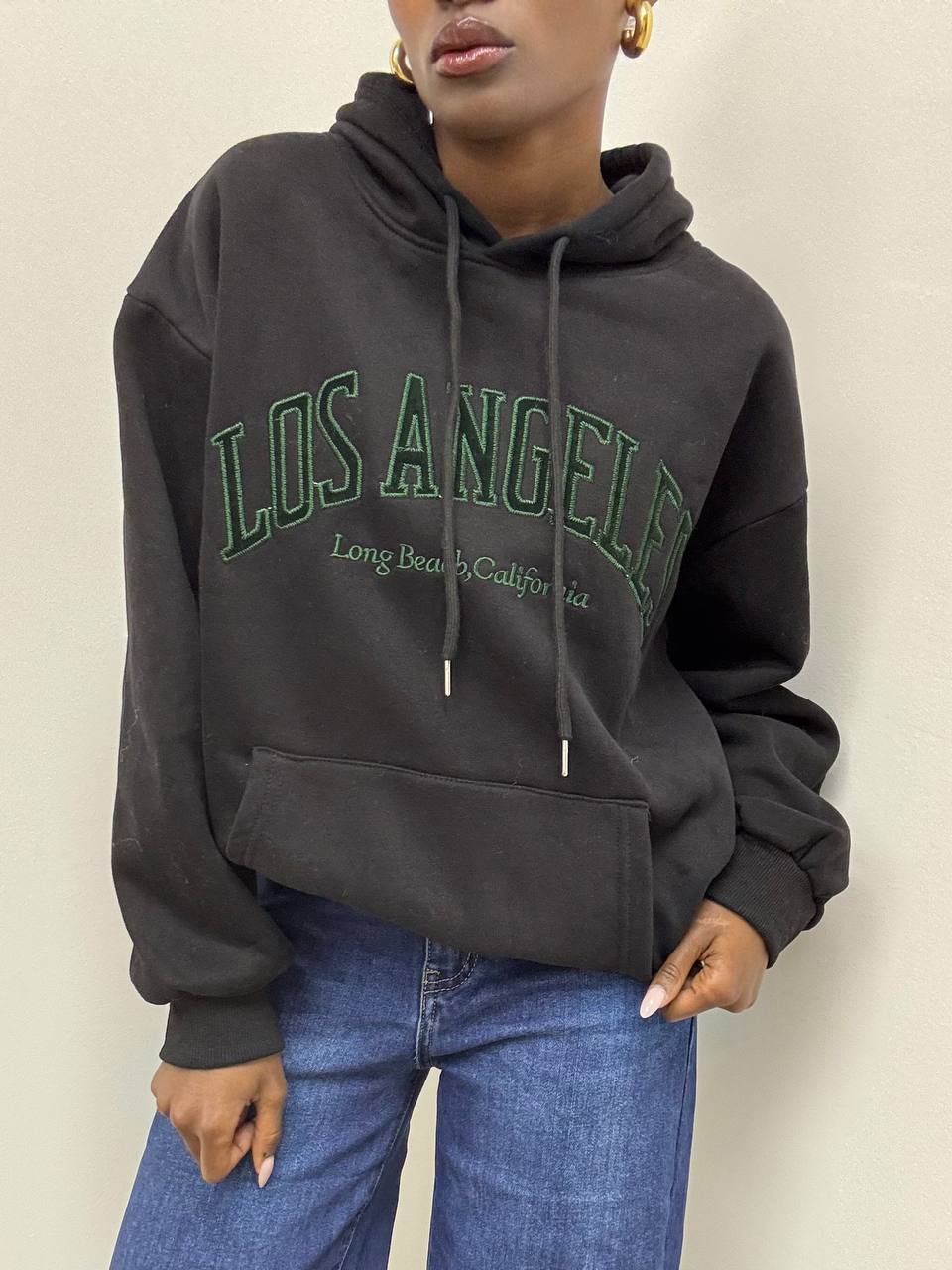 Felpa con cappuccio dal design casual e contemporaneo, realizzata in tessuto elasticizzato per garantire comfort e libertà di movimento. Sul davanti spicca la scritta centrale “Los Angeles”, che dona un tocco urbano e sportivo al capo.
