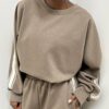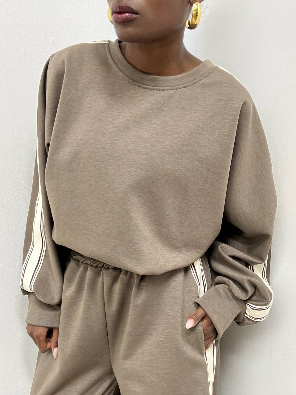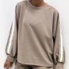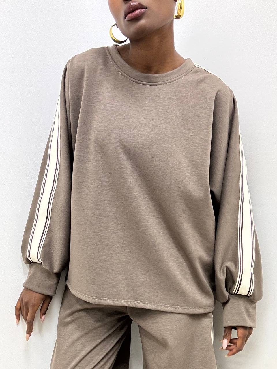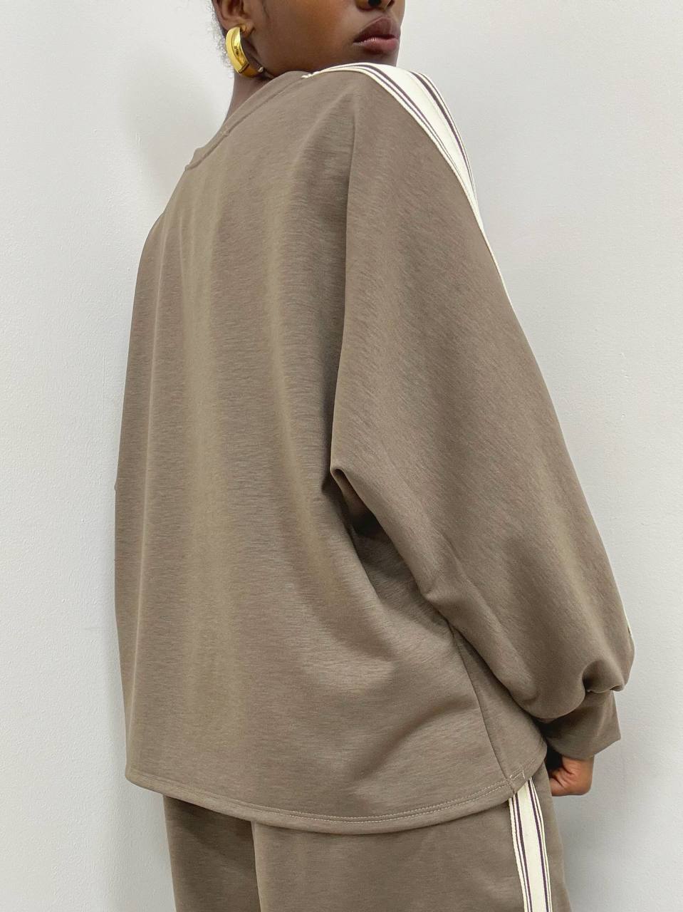 Casual ma ricercata, questa felpa presenta un taglio ampio che assicura comfort e libertà di movimento. Il girocollo classico e i polsini elasticizzati donano una vestibilità morbida ma curata. A rendere unico il design sono le strisce decorative verticali in bianco e beige, che si estendono dalle spalle fino ai polsini, aggiungendo un tocco dinamico e contemporaneo al capo. Perfetta per un look sportivo-chic dal carattere distintivo.