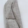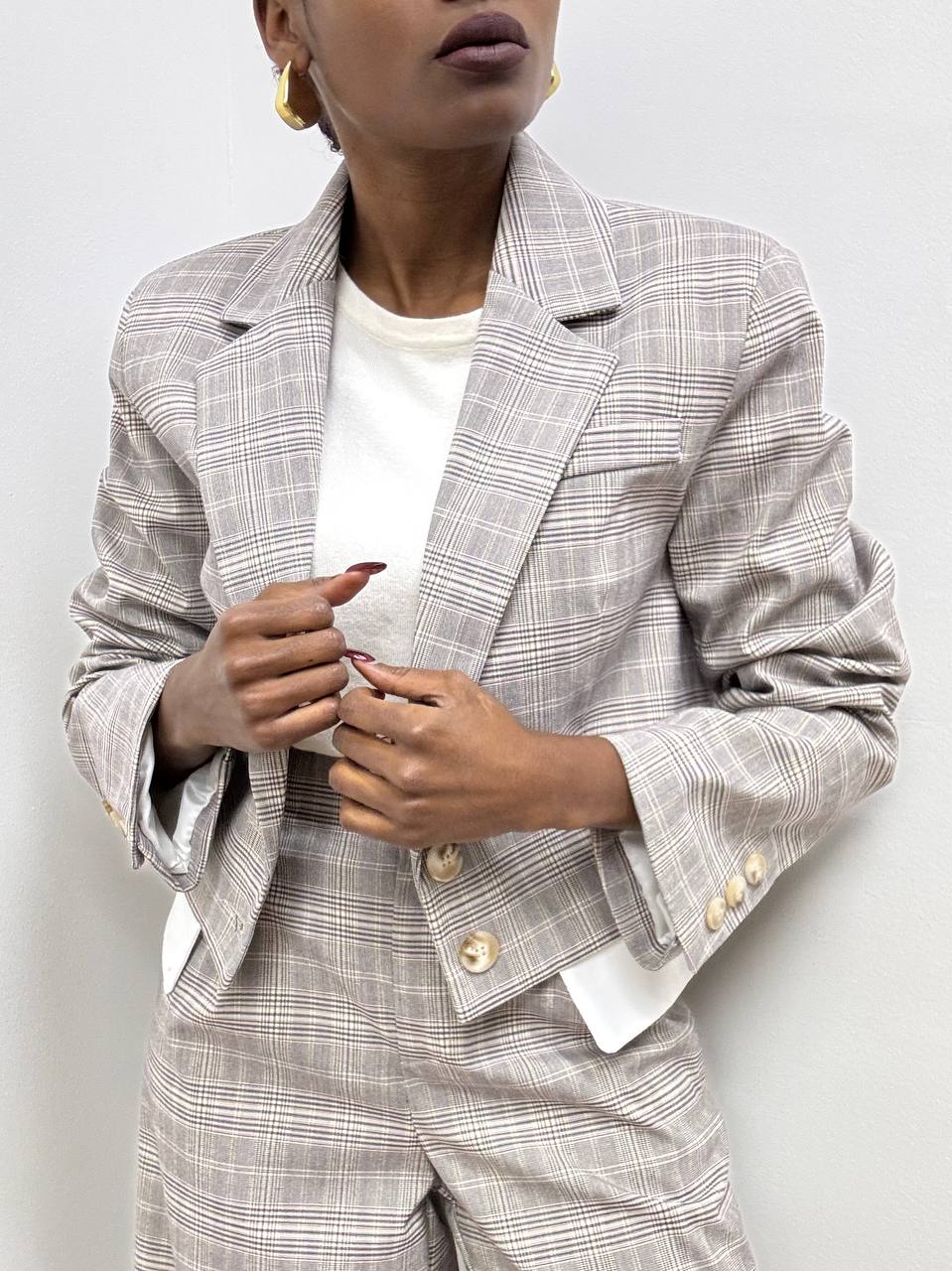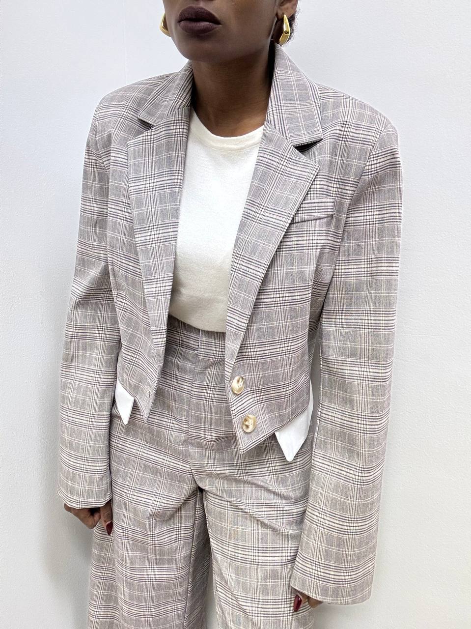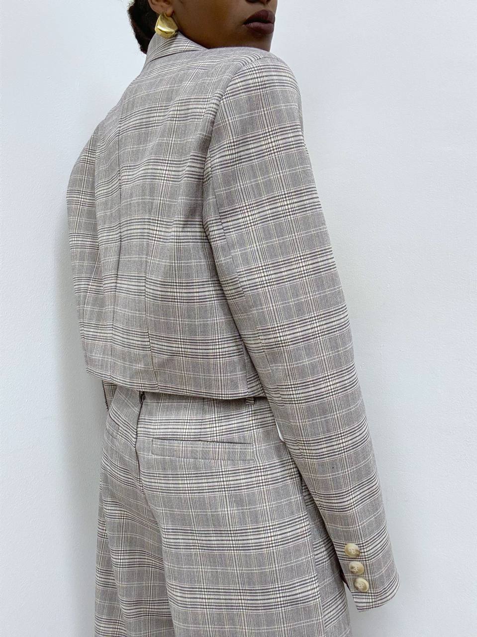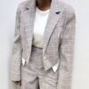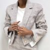 Blazer dal design moderno e raffinato, caratterizzato da un taglio corto che valorizza la silhouette con linee pulite e contemporanee. La chiusura frontale a due bottoni si abbina armoniosamente ai revers a punta, impreziositi da un sofisticato motivo a quadri declinato nei toni del grigio e del marrone chiaro, per un effetto elegante e versatile.
