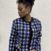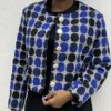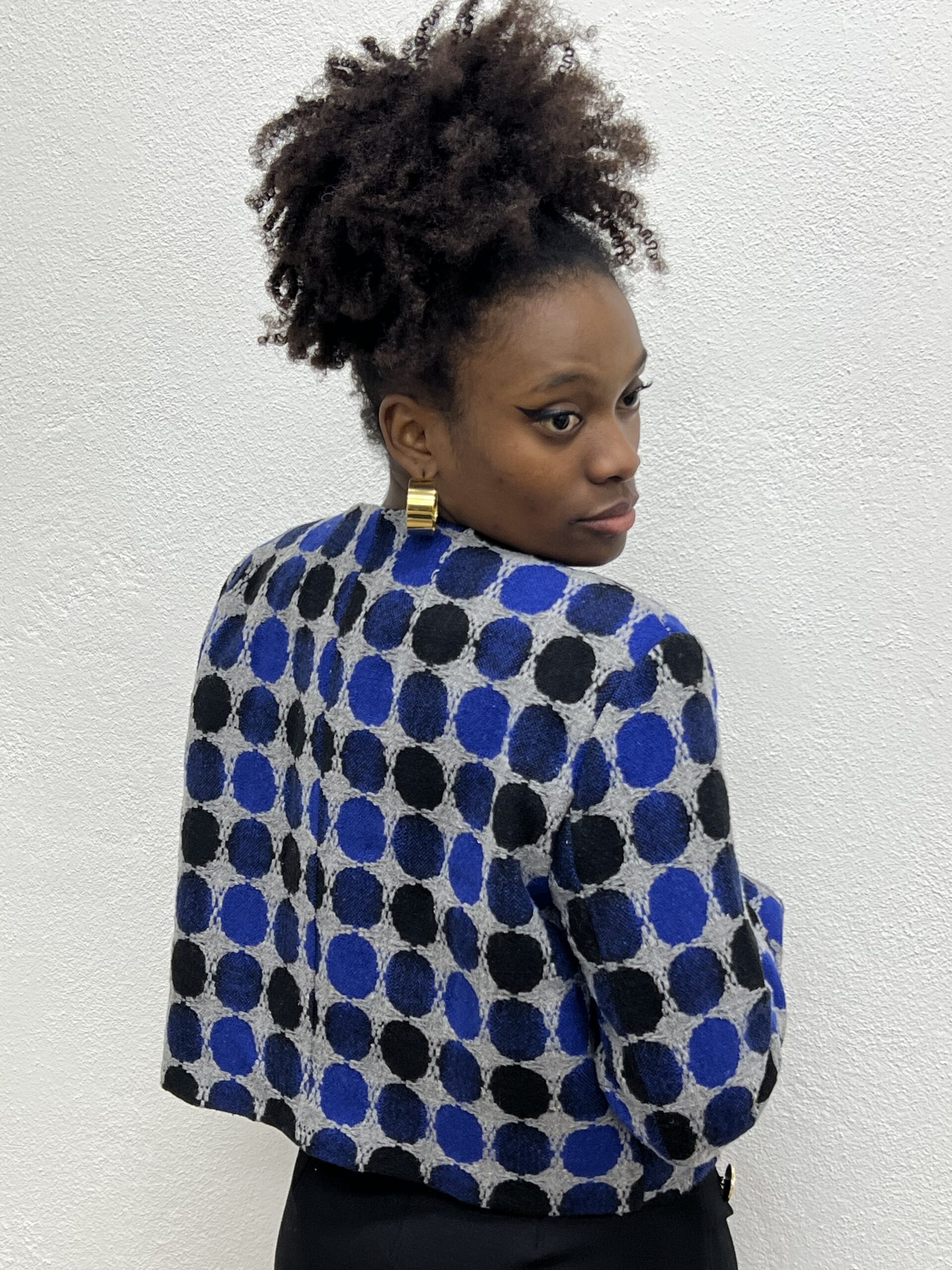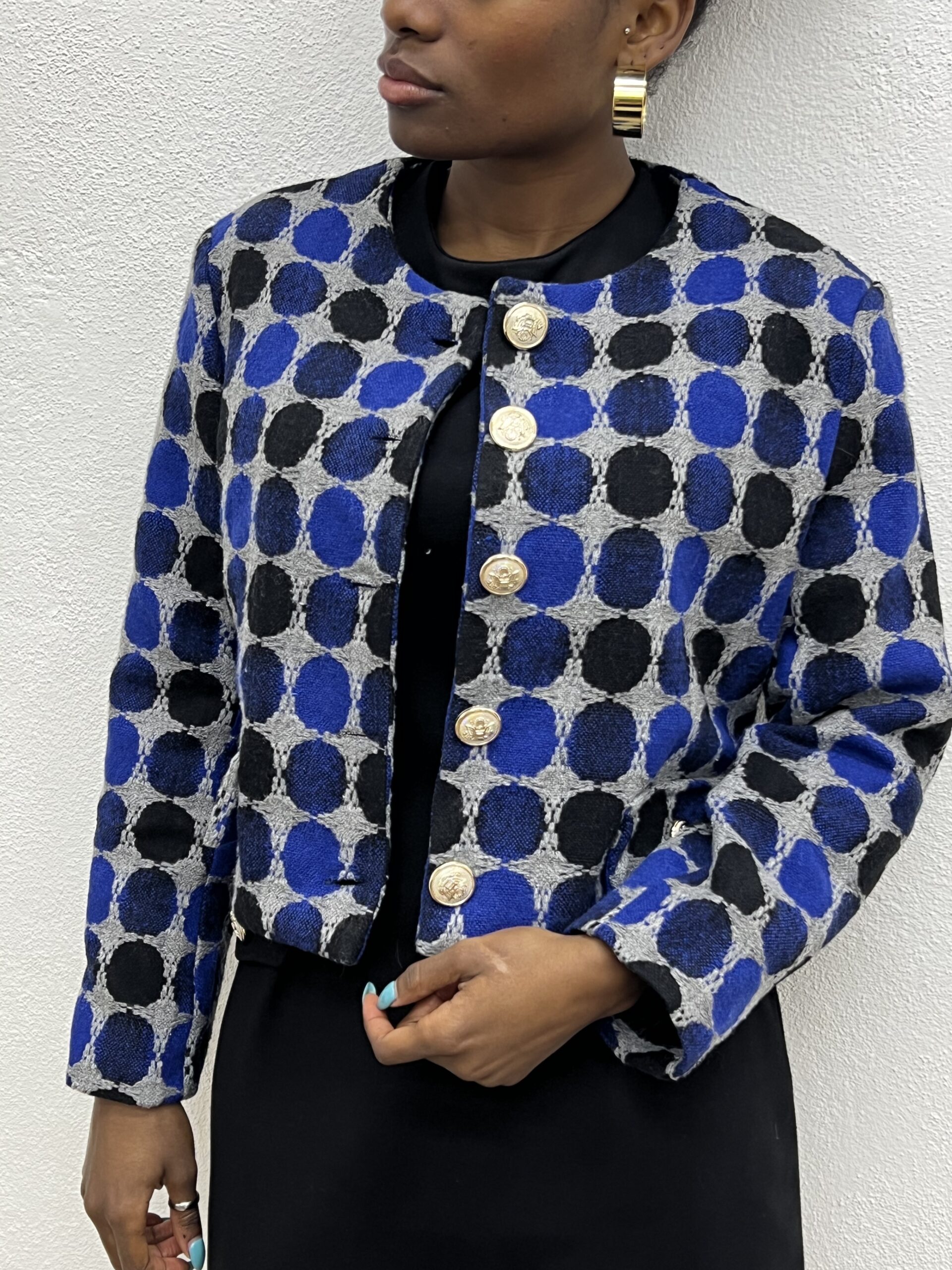 Giacca con pois con spallina imbottita e bottoni goffrati argento su tutta la lunghezza anche sulla taschine.