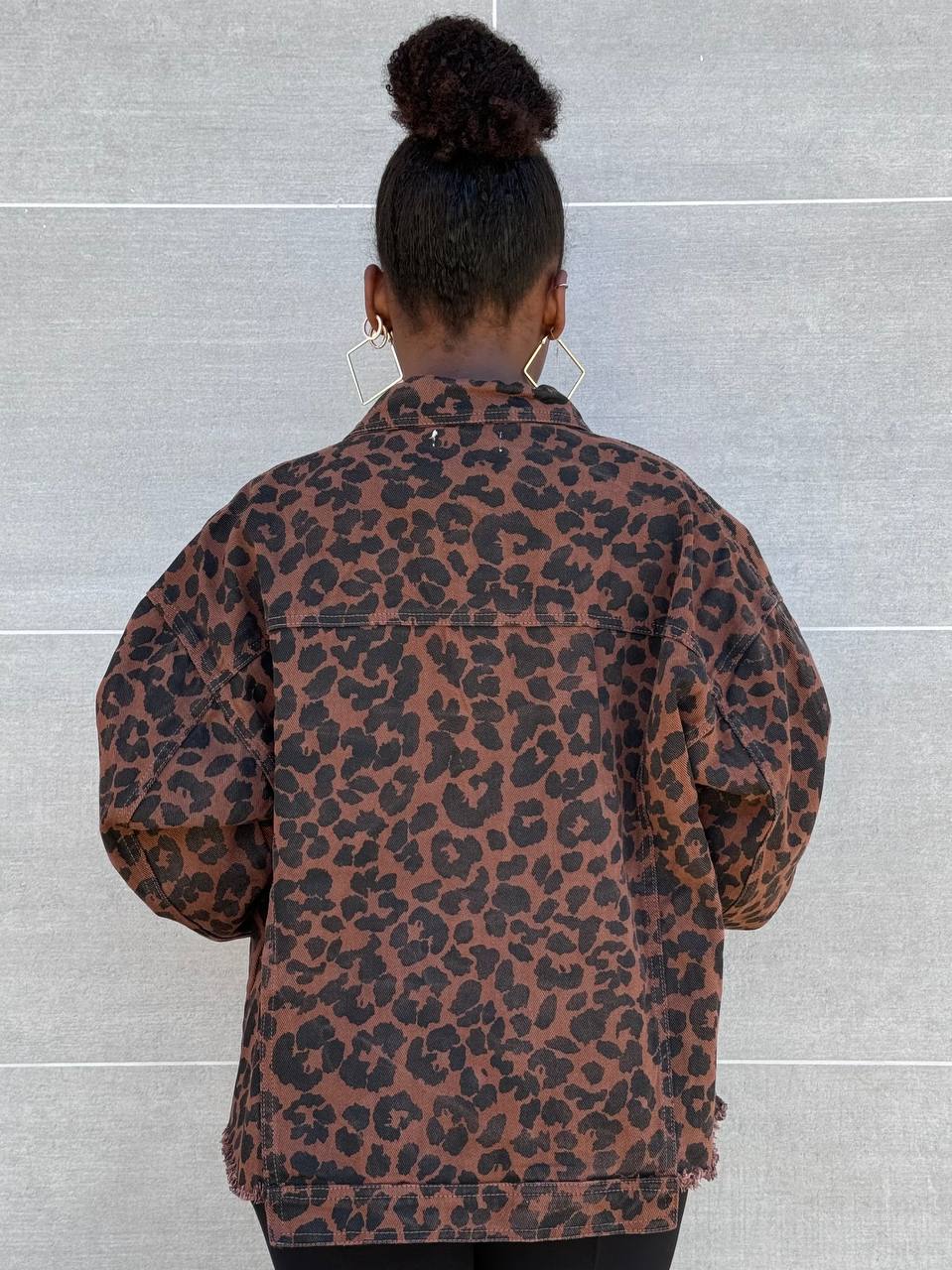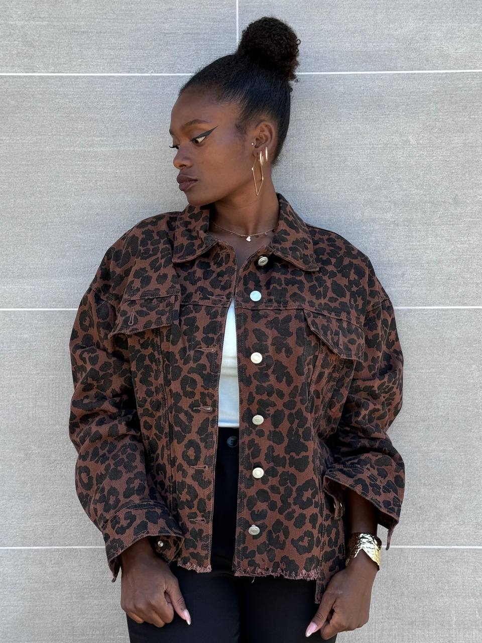 Giacca con stampa animalier a maniche lunghe, abbottonatura frontale, tasche laterali con patta.