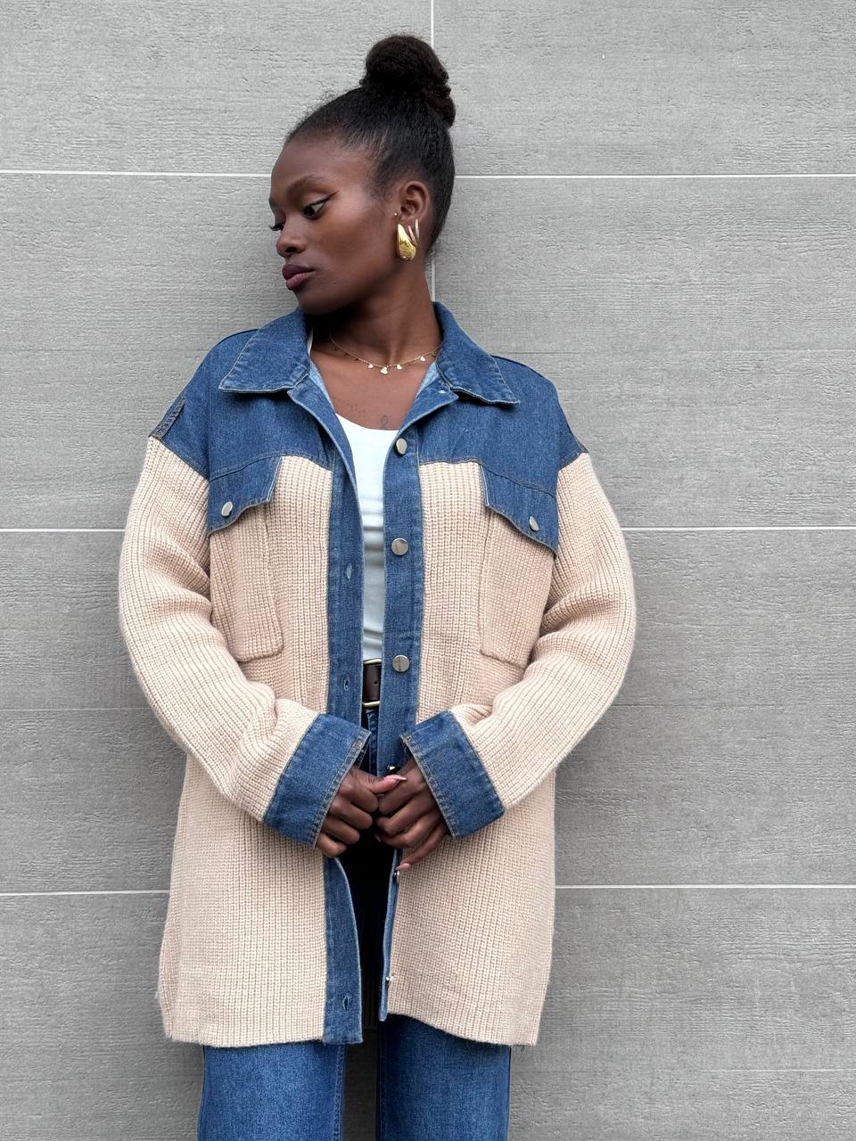 Giacca bitessuto con dettaglio di bottoni di chiusura su tutta la lunghezza con finte taschine sulla parte superiore.