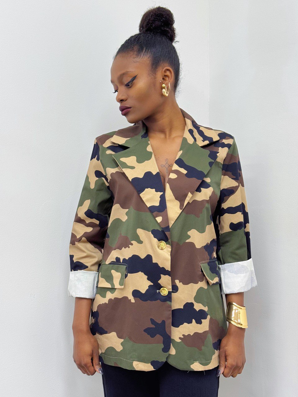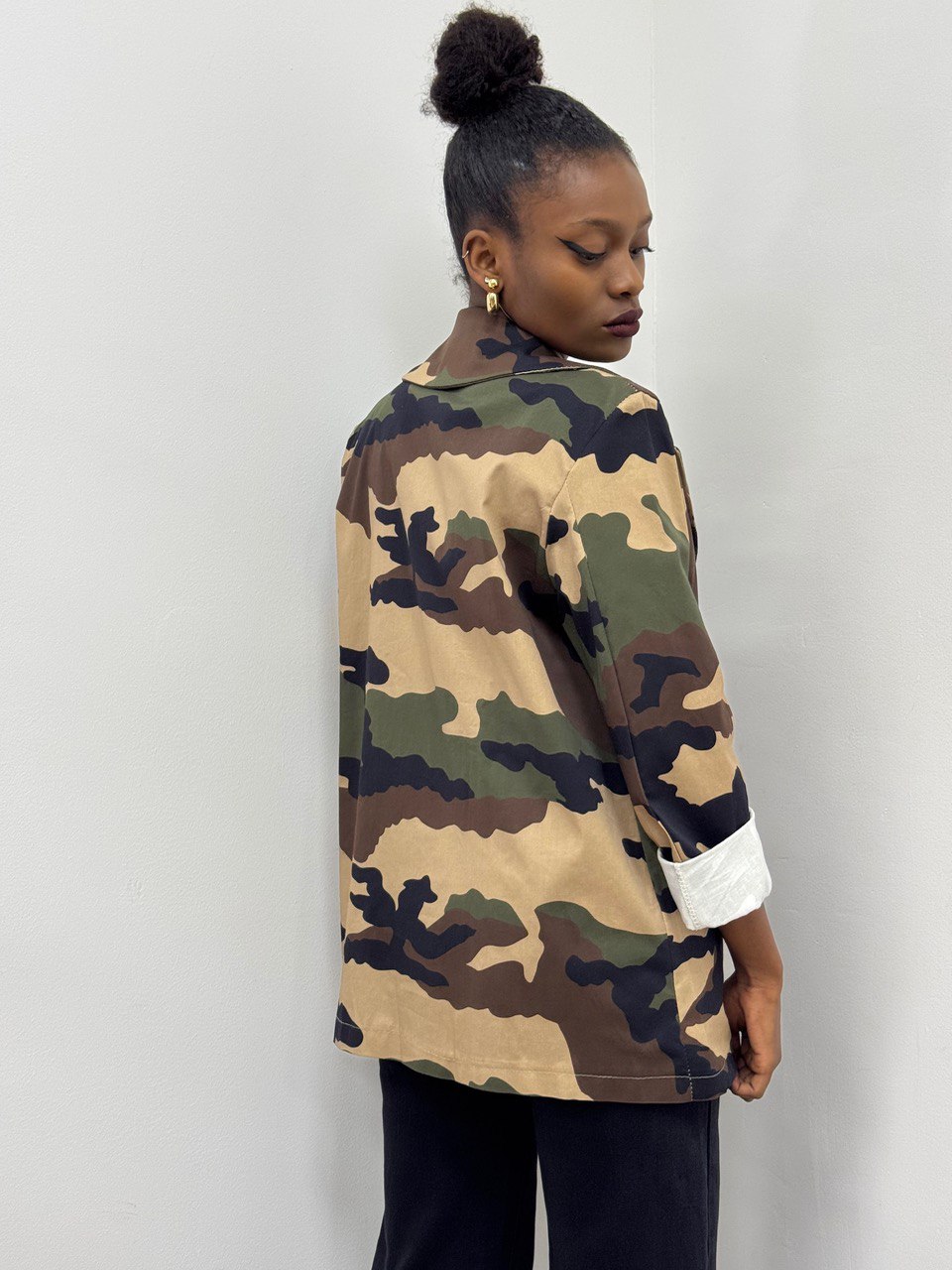 Giacca camuflage con dettaglio di  due bottoni di chiusura e taschine laterali.