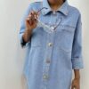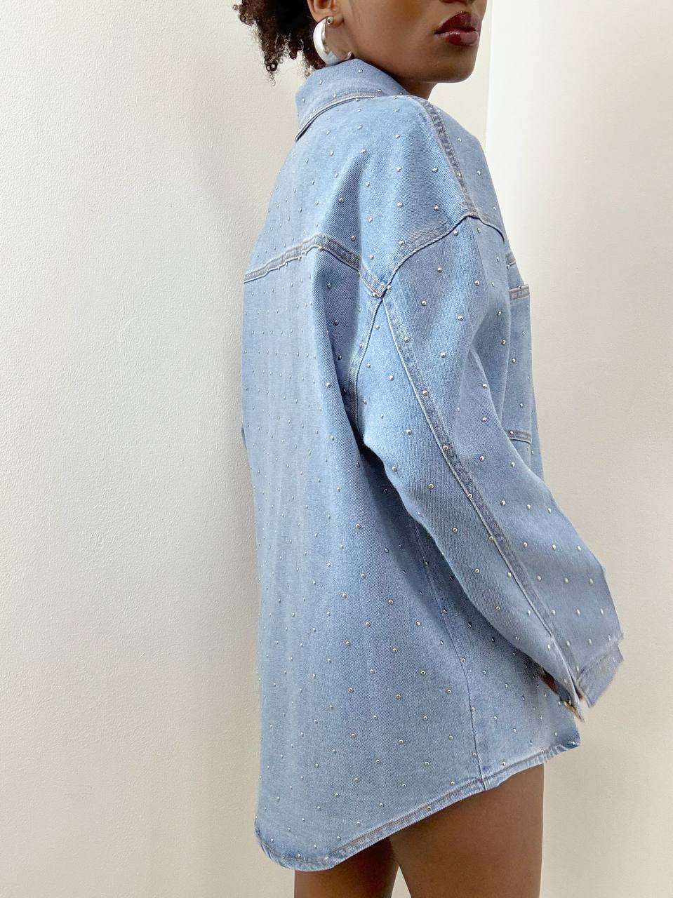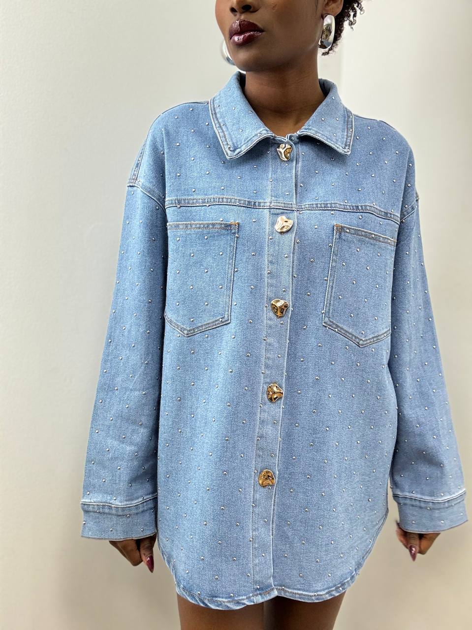 Camicia in denim dal carattere deciso e contemporaneo, perfetto per chi ama distinguersi con dettagli luminosi. Il capo è impreziosito da borchiette applicate su tutta la lunghezza, che donano brillantezza e un tocco glamour senza rinunciare allo stile casual del jeans.