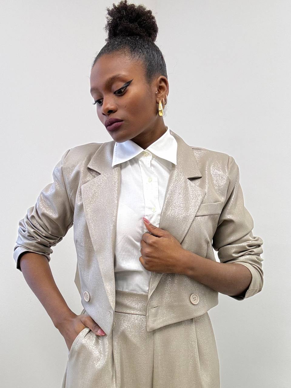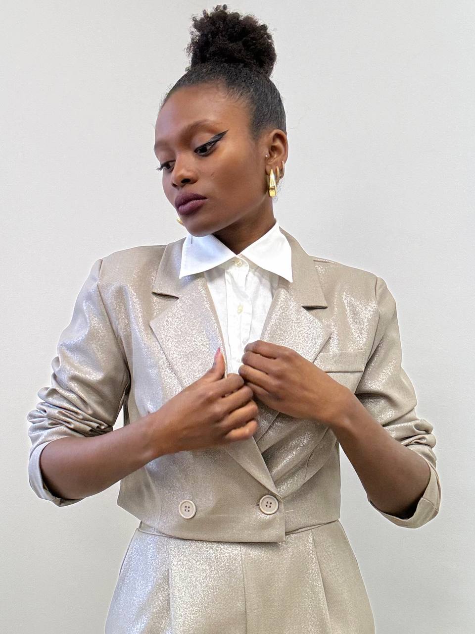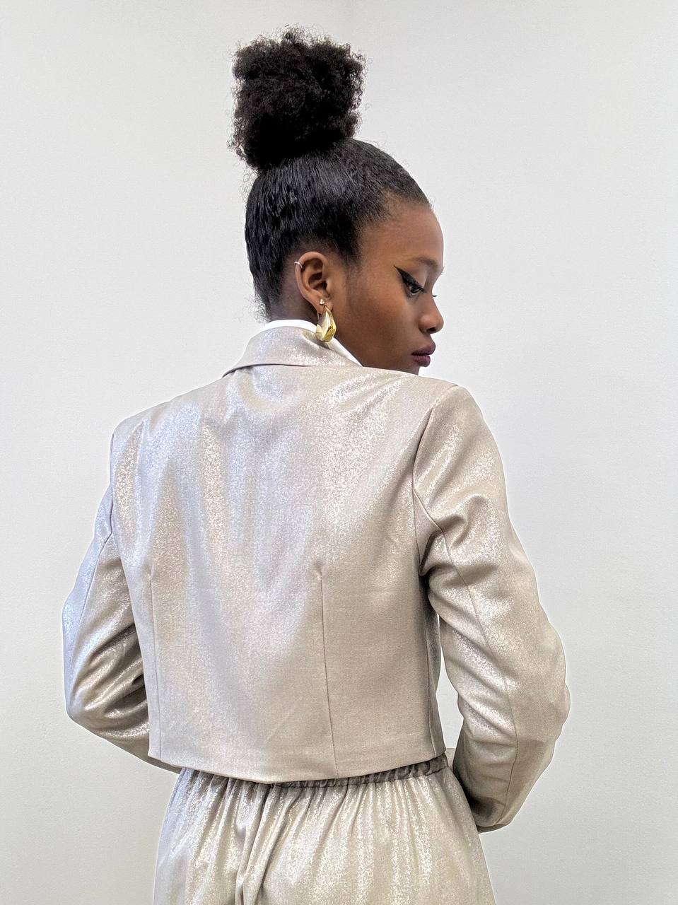 Giacca crop ad effetto spalmato a tinta unita con finta taschina laterale con chiusura laterale di due bottoni.