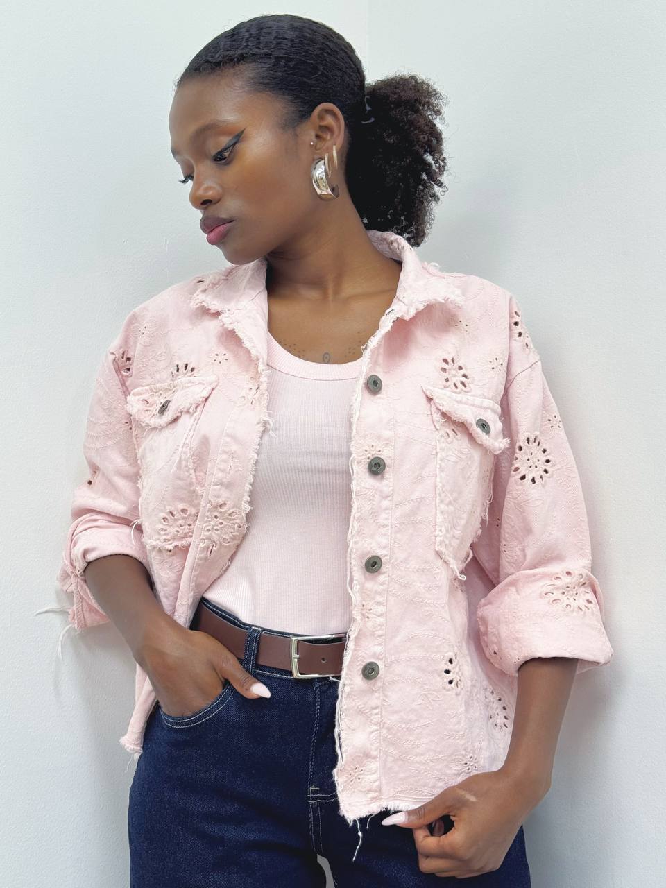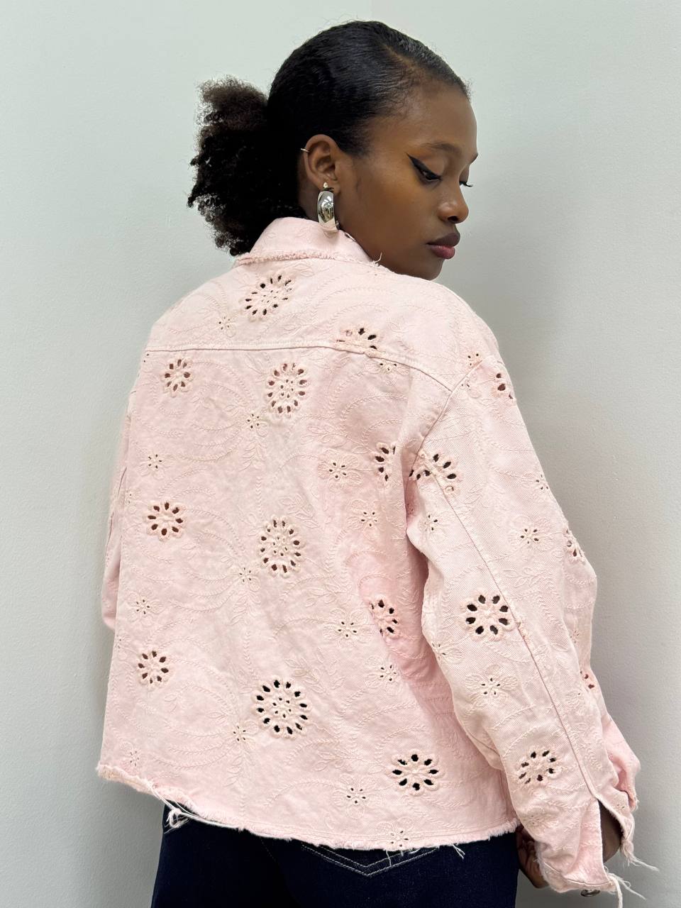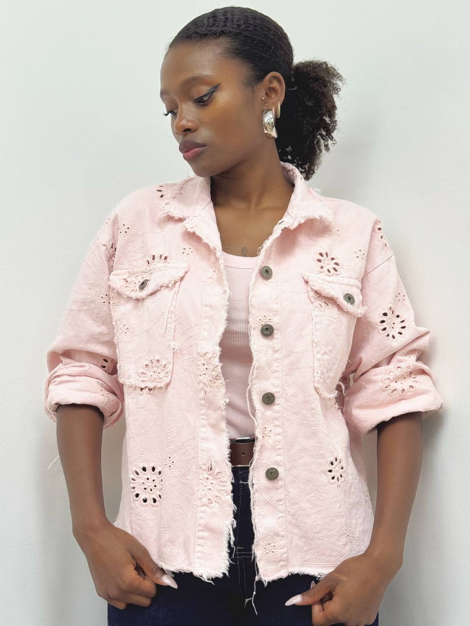 Giacca in pizzo con dettaglio di fiori ricamati con dettaglio di abbottonatura frontale su tutta la lunghezza,