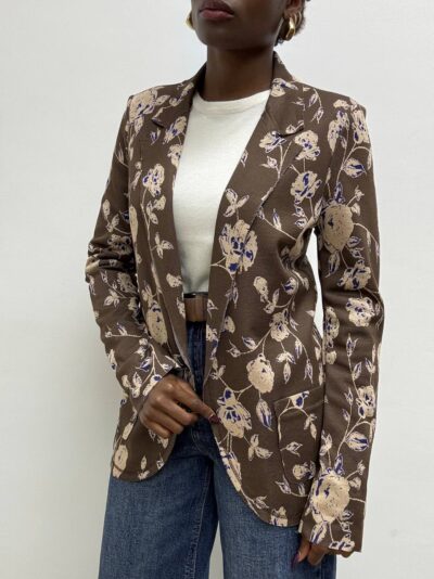 Giacca in jersey dallo stile femminile e raffinato, impreziosita da una stampa di rose su tutta la lunghezza. Il tessuto morbido ed elasticizzato garantisce comfort e vestibilità, mentre il design moderno la rende perfetta sia per look casual che più eleganti. Un capo versatile e romantico, ideale per aggiungere un tocco floreale al tuo guardaroba.
