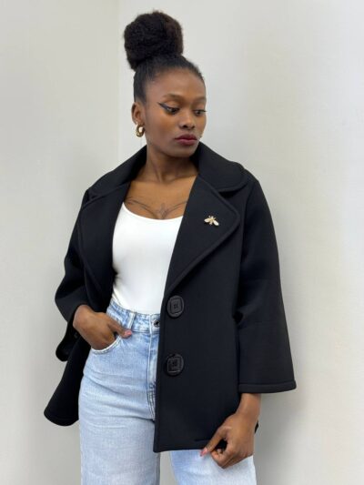 Giacca in neoprene con dettaglio di bottone di chiusura e dettaglio di spilla.