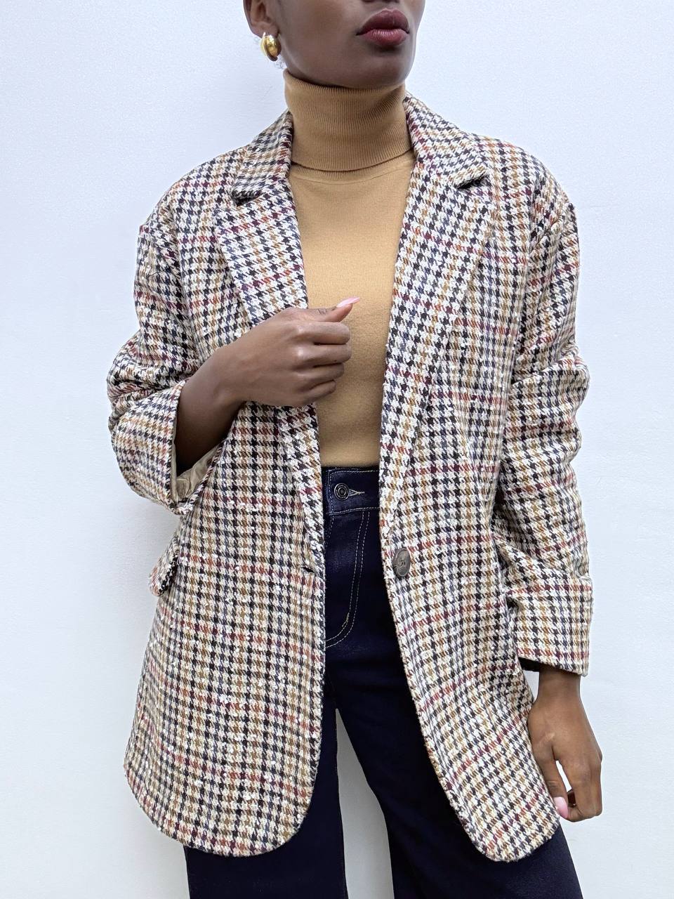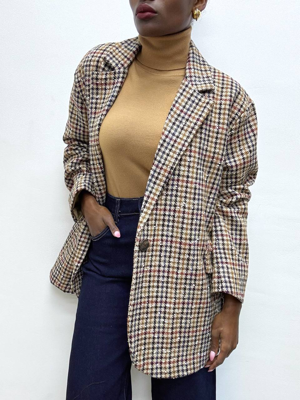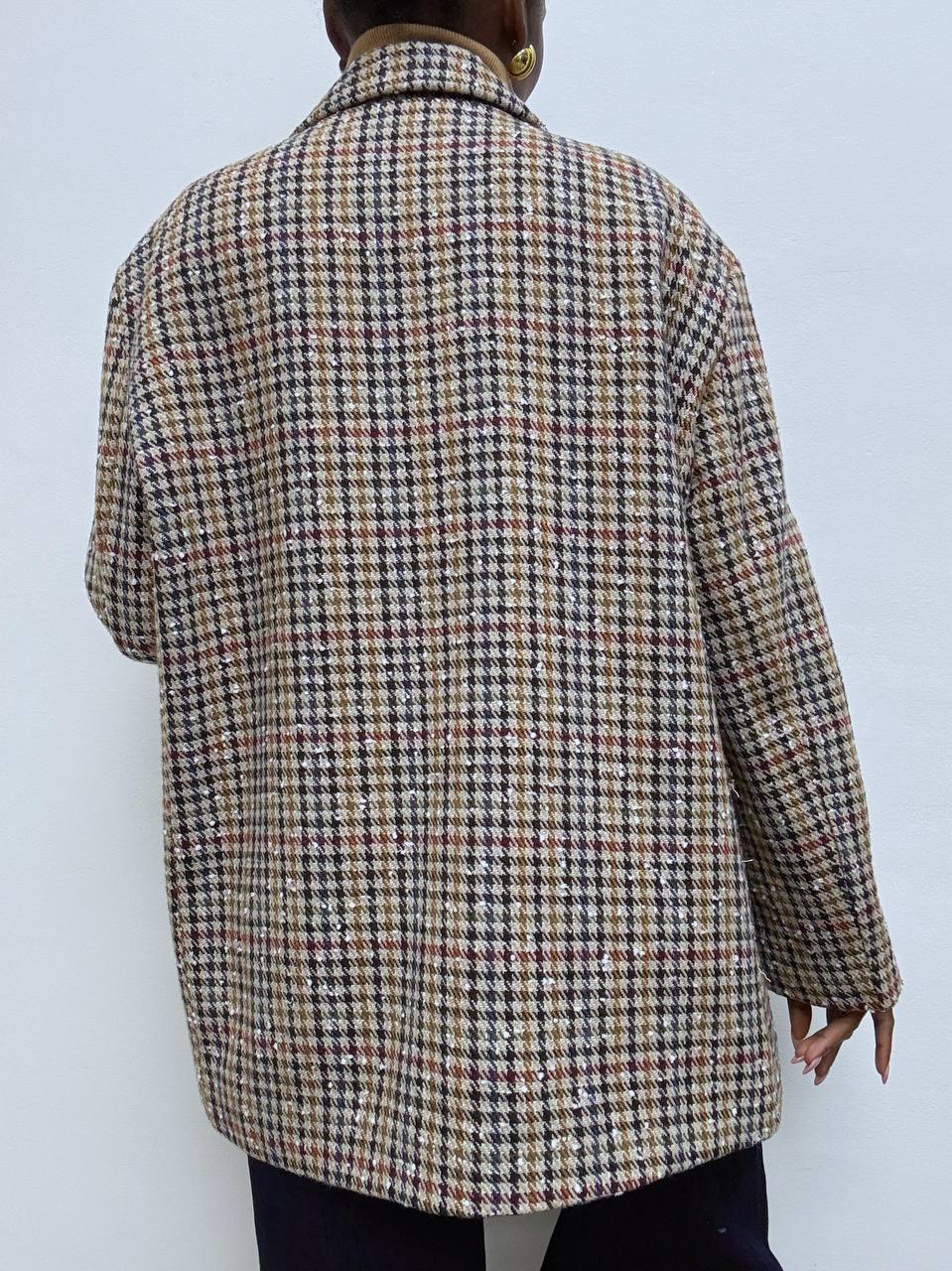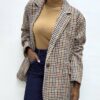Questa giacca oversize, caratterizzata dal raffinato motivo pied de poule, reinterpreta un classico della sartoria in chiave contemporanea. Il design monopetto con chiusura a un bottone ne esalta la linea morbida e moderna, mentre il colletto revers aggiunge un tocco di eleganza senza tempo. Le tasche anteriori a filetto con patta completano il capo con un dettaglio funzionale e ricercato. Perfetta per look sofisticati o casual chic, è la giacca ideale per chi desidera un equilibrio armonioso tra tradizione e stile attuale.