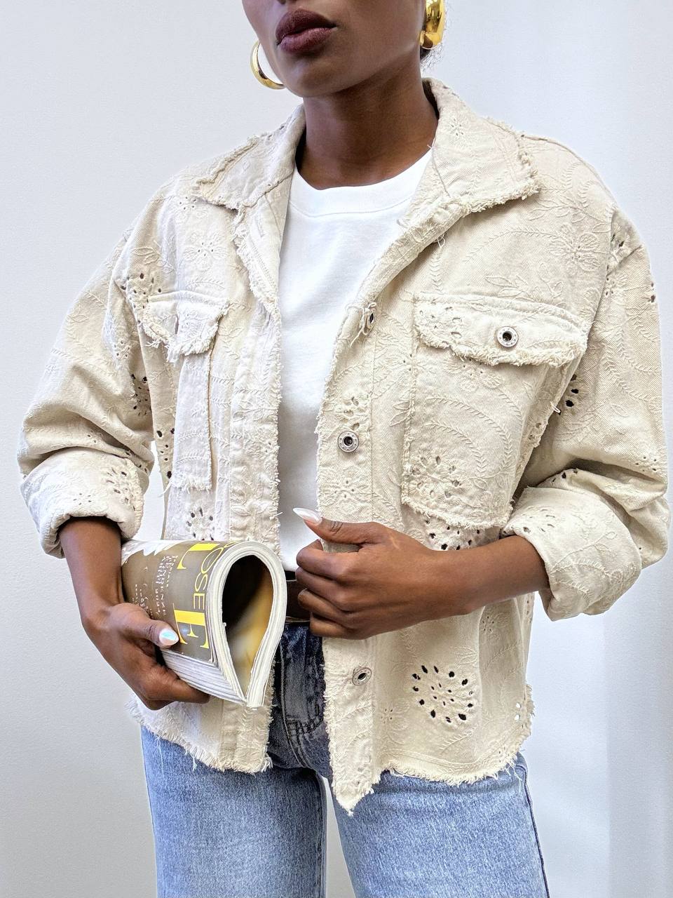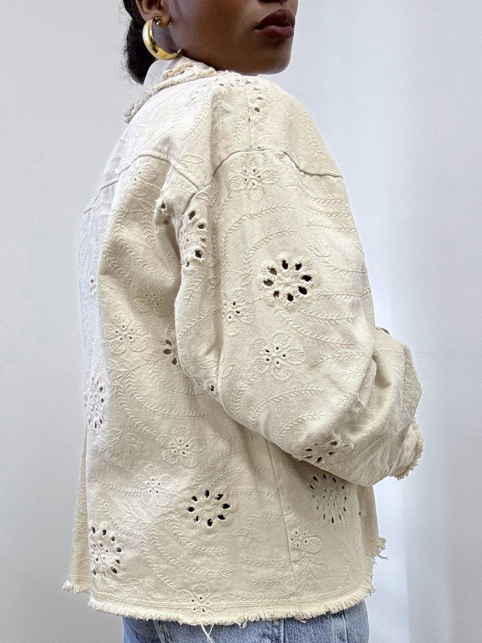Questa giacca in jeans in pizzo San Gallo è un capo unico che unisce la robustezza del denim alla delicatezza dei ricami traforati all over. Il profilo sfrangiato aggiunge un irresistibile tocco vintage, mentre le due tasche applicate sul petto combinano stile e praticità. Realizzata in 100% cotone, garantisce comfort e qualità, rendendola perfetta per chi cerca un look femminile, raffinato e dal carattere retrò.