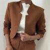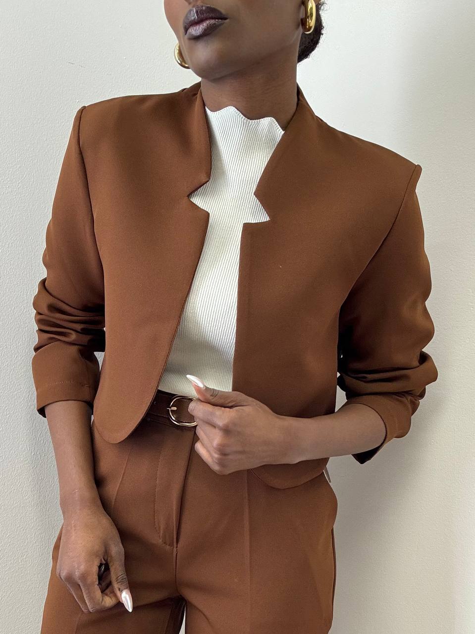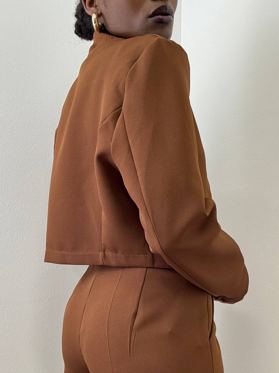 Una giacca taglio crop dallo stile essenziale e contemporaneo, pensata per valorizzare la silhouette con un tocco moderno. La lunghezza corta mette in risalto il punto vita, rendendola perfetta per completare outfit sia eleganti che casual.