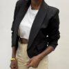 Giacca elegante a maniche lunghe, dal taglio corto e femminile, pensata per valorizzare la silhouette con raffinatezza. Realizzata in un tessuto strutturato ma morbido, la giacca è priva di chiusura frontale, lasciando che cada naturalmente lungo il busto per un effetto moderno e chic. Sul fondo della giacca, a livello della vita, si trovano due tasche finte con patta, dettagli decorativi che richiamano lo stile sartoriale classico, donando carattere senza compromettere la linea pulita del capo, studiato per adattarsi armoniosamente a diverse fisicità da una taglia 38 a una 46 veste in modo impeccabile grazie al taglio strutturato e alla qualità dei materiali. Per un look coordinato e raffinato, la giacca può essere abbinata al pantalone flare color nero, dando vita a un completo armonioso e raffinato. L’equilibrio tra il taglio corto e strutturato della giacca e la linea svasata del pantalone contribuisce a valorizzare la silhouette, offrendo un look contemporaneo, sofisticato e adatto a diverse occasioni formali o professionali.