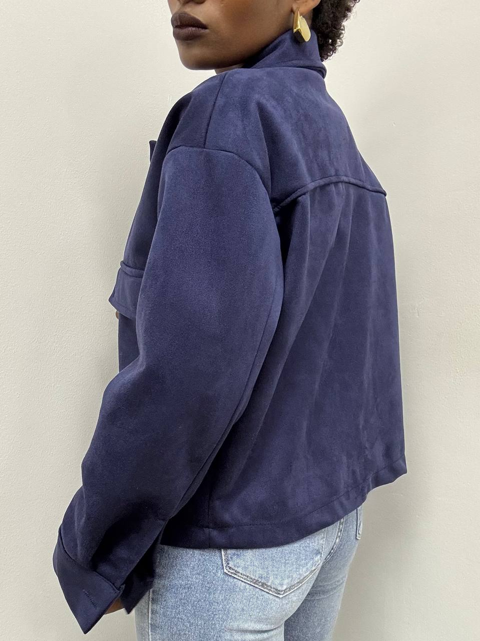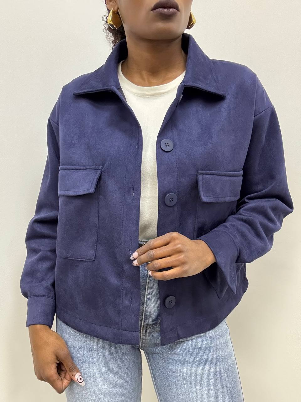 Giacca dal design raffinato, realizzata in morbido tessuto effetto suede dalla mano vellutata e dall’aspetto elegante. La linea corta e strutturata conferisce al capo un carattere contemporaneo, mantenendo un’eleganza senza tempo. Il colletto classico e la chiusura frontale con bottoni tono su tono esaltano la pulizia delle linee e la cura sartoriale dei dettagli.