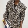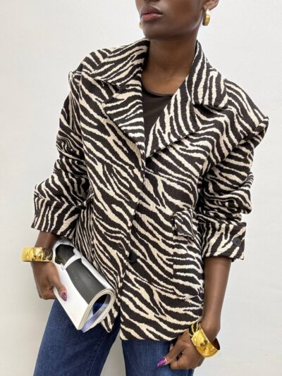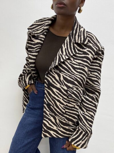 Giacca dal carattere deciso e sofisticato, realizzata in tessuto stampato con motivo zebrato nei toni del cioccolato e beige. Il design presenta una chiusura centrale con due bottoni, che definisce elegantemente la silhouette, rendendo il capo versatile sia per look formali che casual-chic.