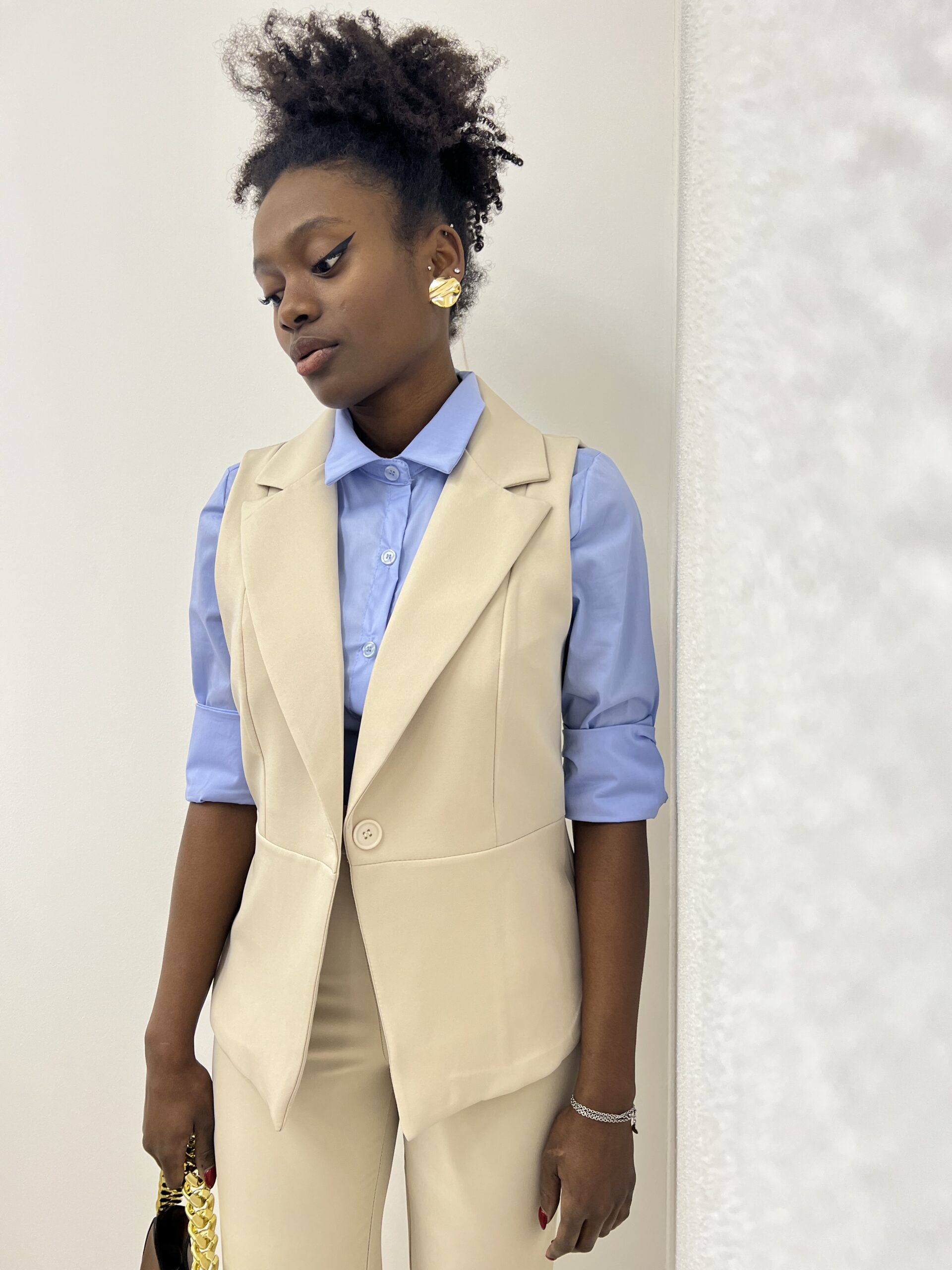 Gilet con scollo a V con dettaglio di bottone di chiusura tono su tono. Fodera interna.