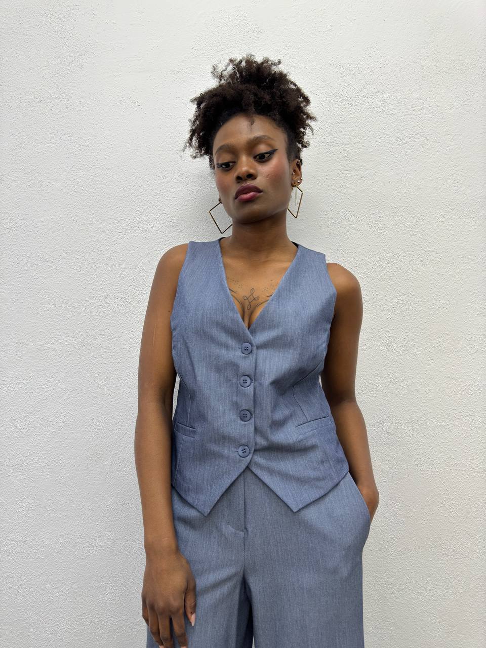 Gilet elasticizzato con chiusura di bottoni su tutta la lunghezza con finte taschine laterali a tinta unita.