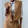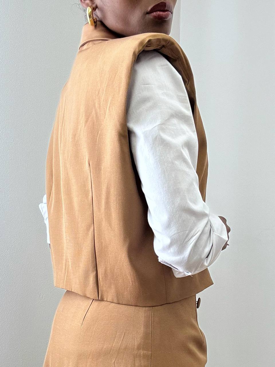 Gilet smanicato dal design elegante e contemporaneo, caratterizzato da una linea strutturata che valorizza la silhouette. Presenta uno scollo a V profondo che slancia la figura e una chiusura frontale rifinita con due bottoni finali, dettaglio che dona equilibrio e raffinatezza al capo.