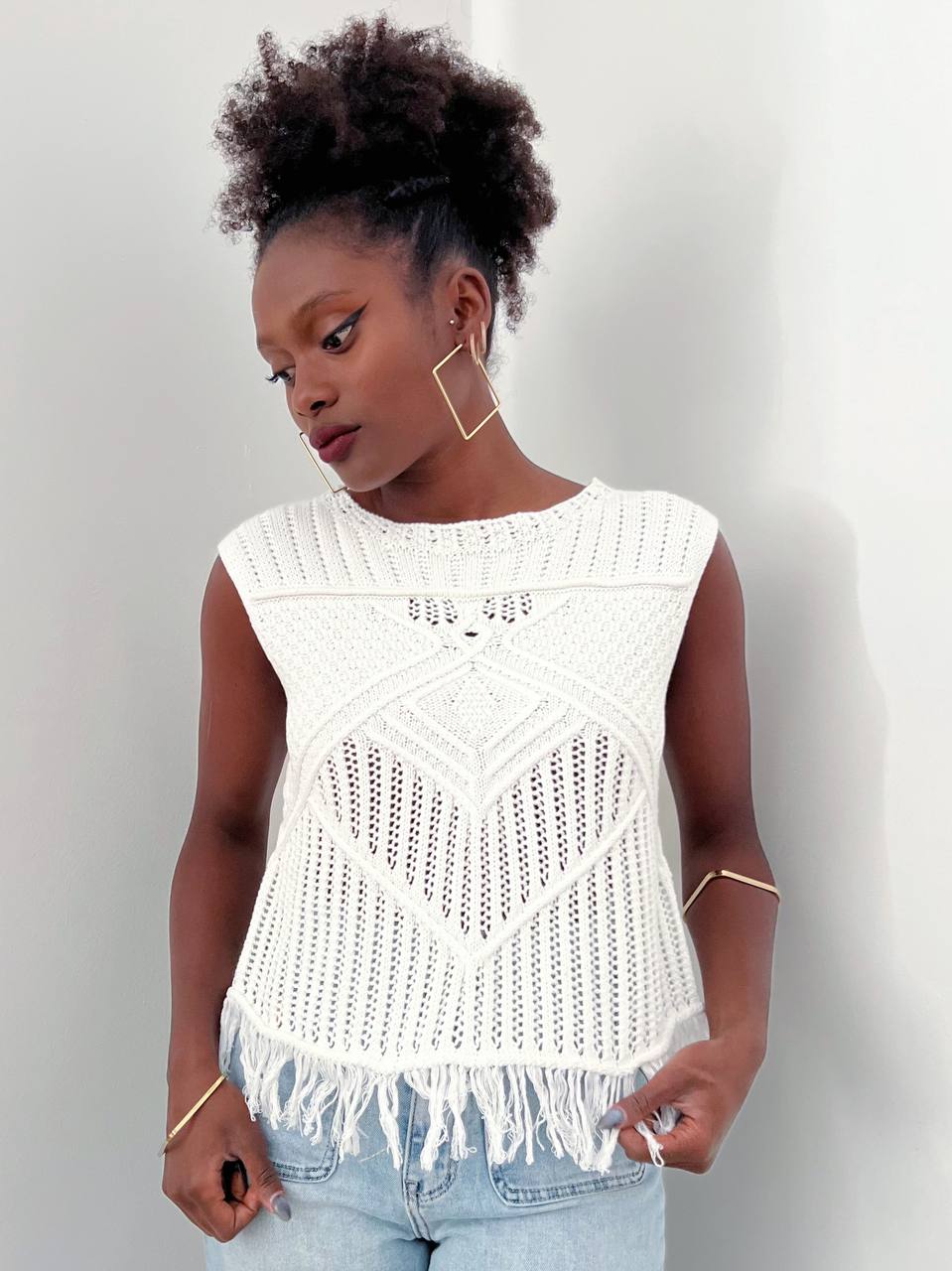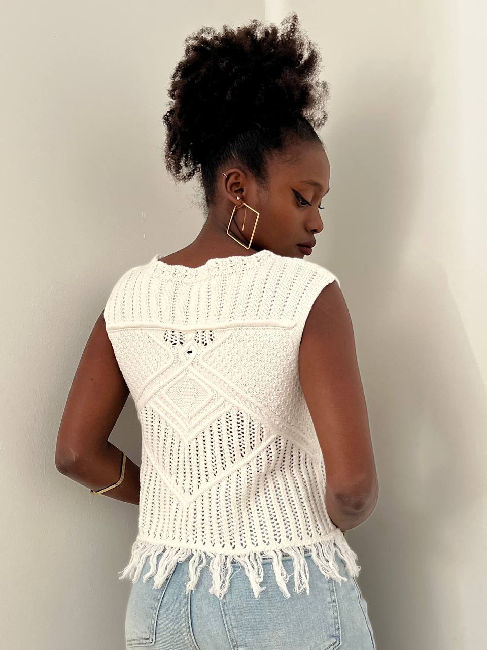 Gilet smanicato ad uncinetto a tinta unita con dettaglio di frange.