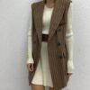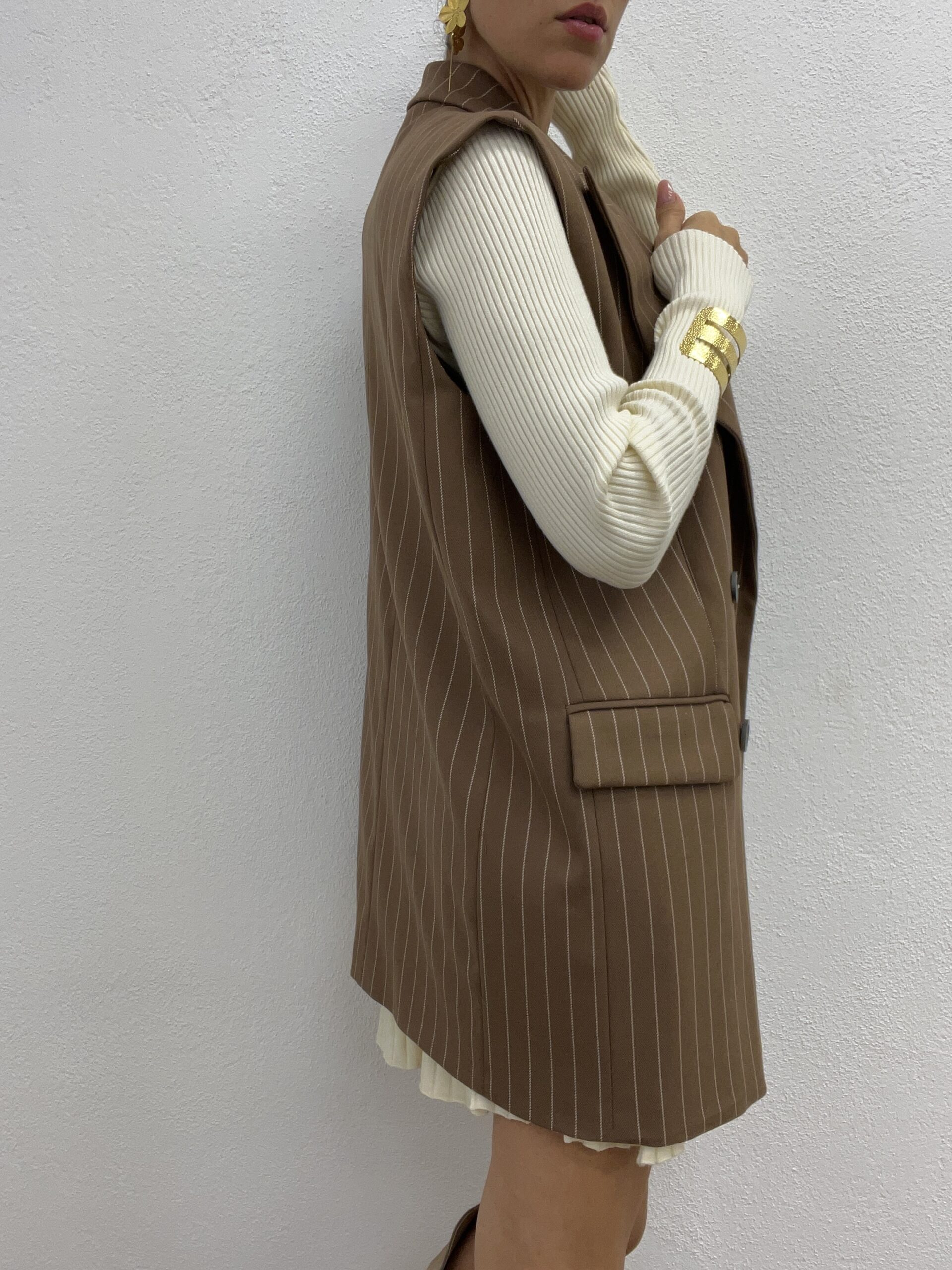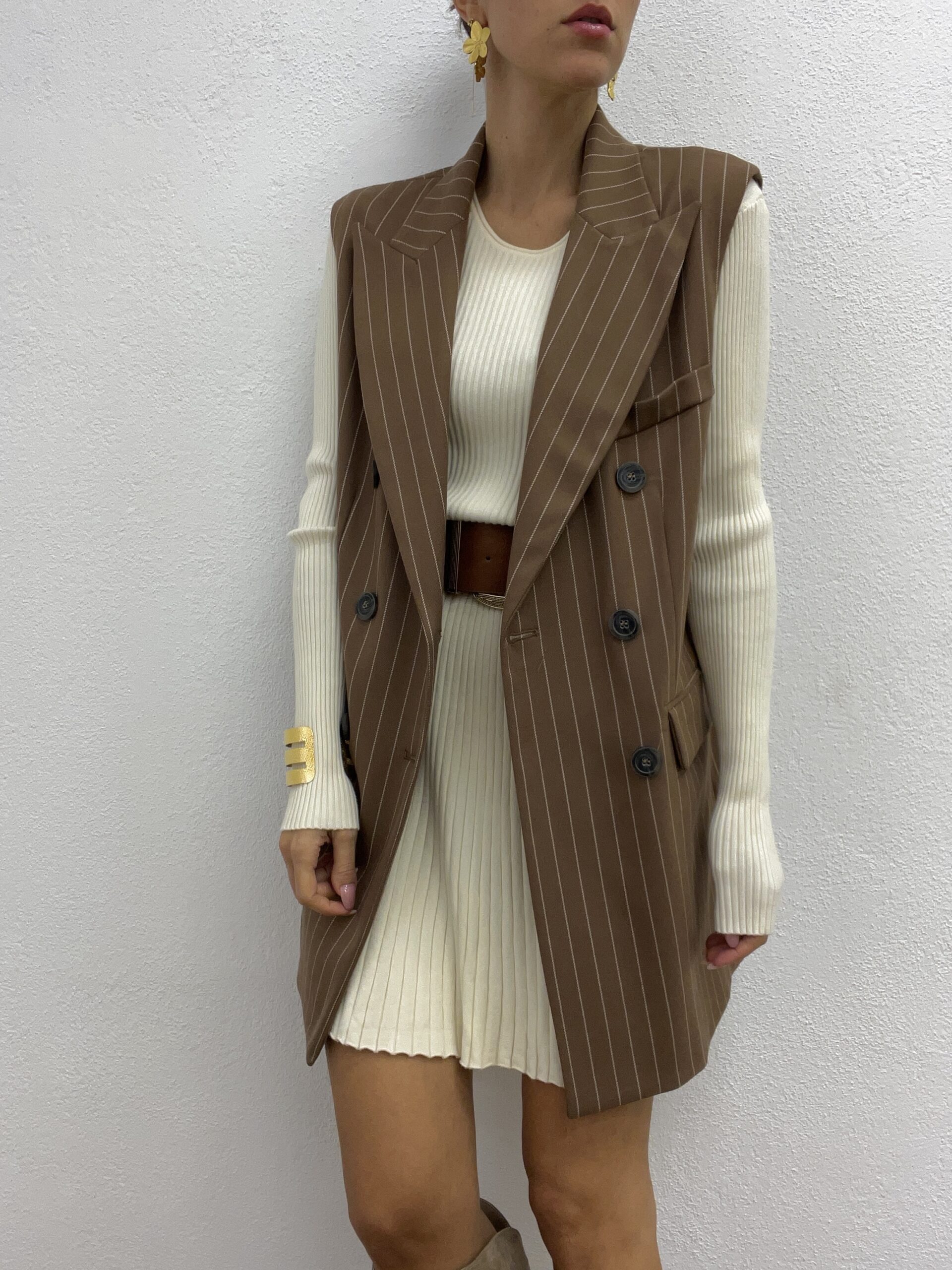 Gilet Gessato doppiopetto smanicato con chiusura di bottoni tono su ton0. Finte taschine laterali.