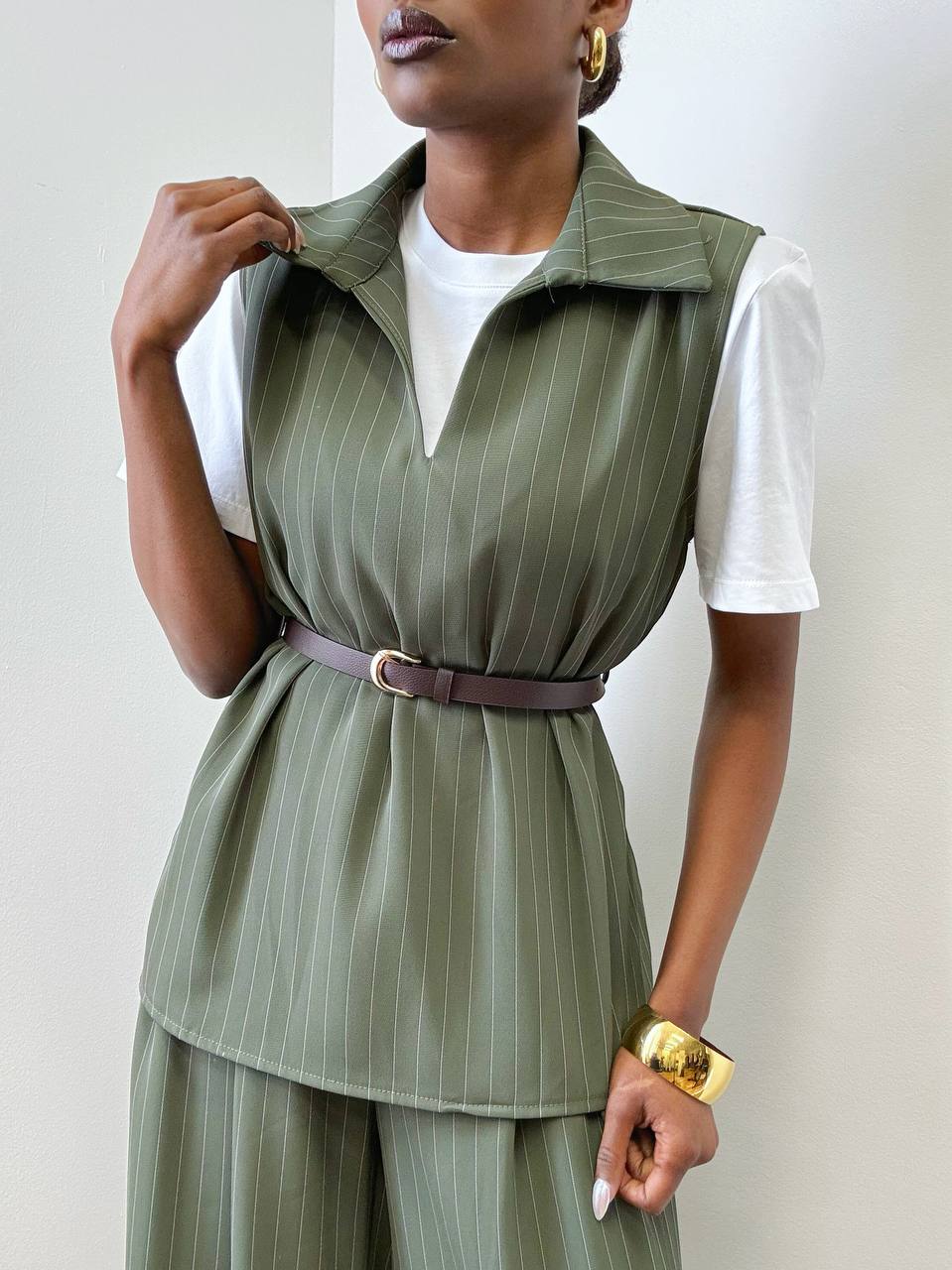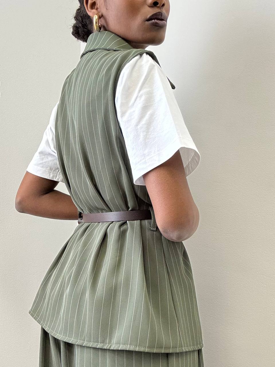 Un gilet smanicato gessato dal design elegante e contemporaneo, pensato per valorizzare la silhouette con stile. Il taglio è pulito e strutturato, arricchito dal classico motivo gessato che dona un’allure sofisticata e senza tempo.